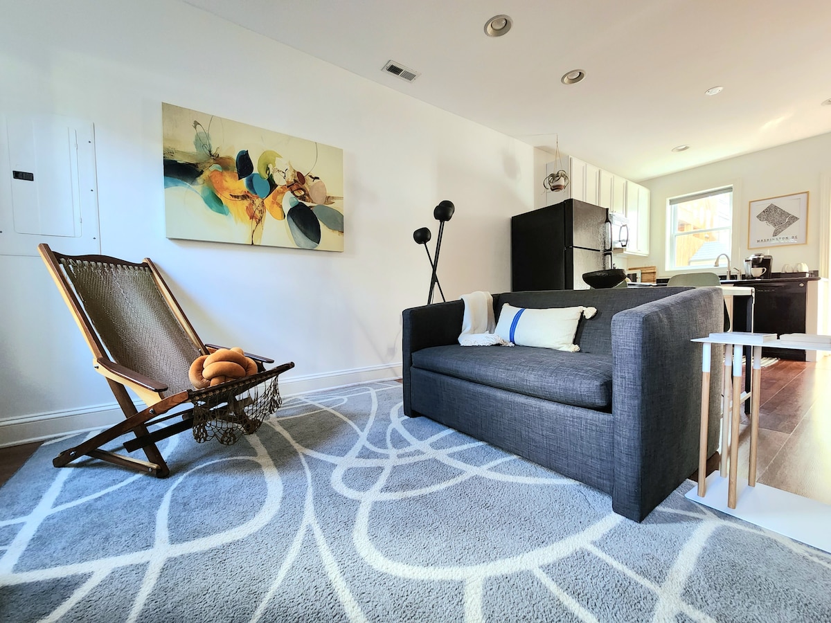 Perfect open space for 1-2 guests. Comfy king-sized bed, couch, work space, mini fridge, microwave, electric kettle, and Keurig (but not a full kitchen). Private entry, space into basement unit and private bathroom. Near fabulous restaurants/ bars. About 15-min. walk to Metro green line. Note: While suite is private and closed to main home, home has 2 cats—a consideration for those with allergies. Also, it’s an old, connected home with original floors, and thus not soundproof.