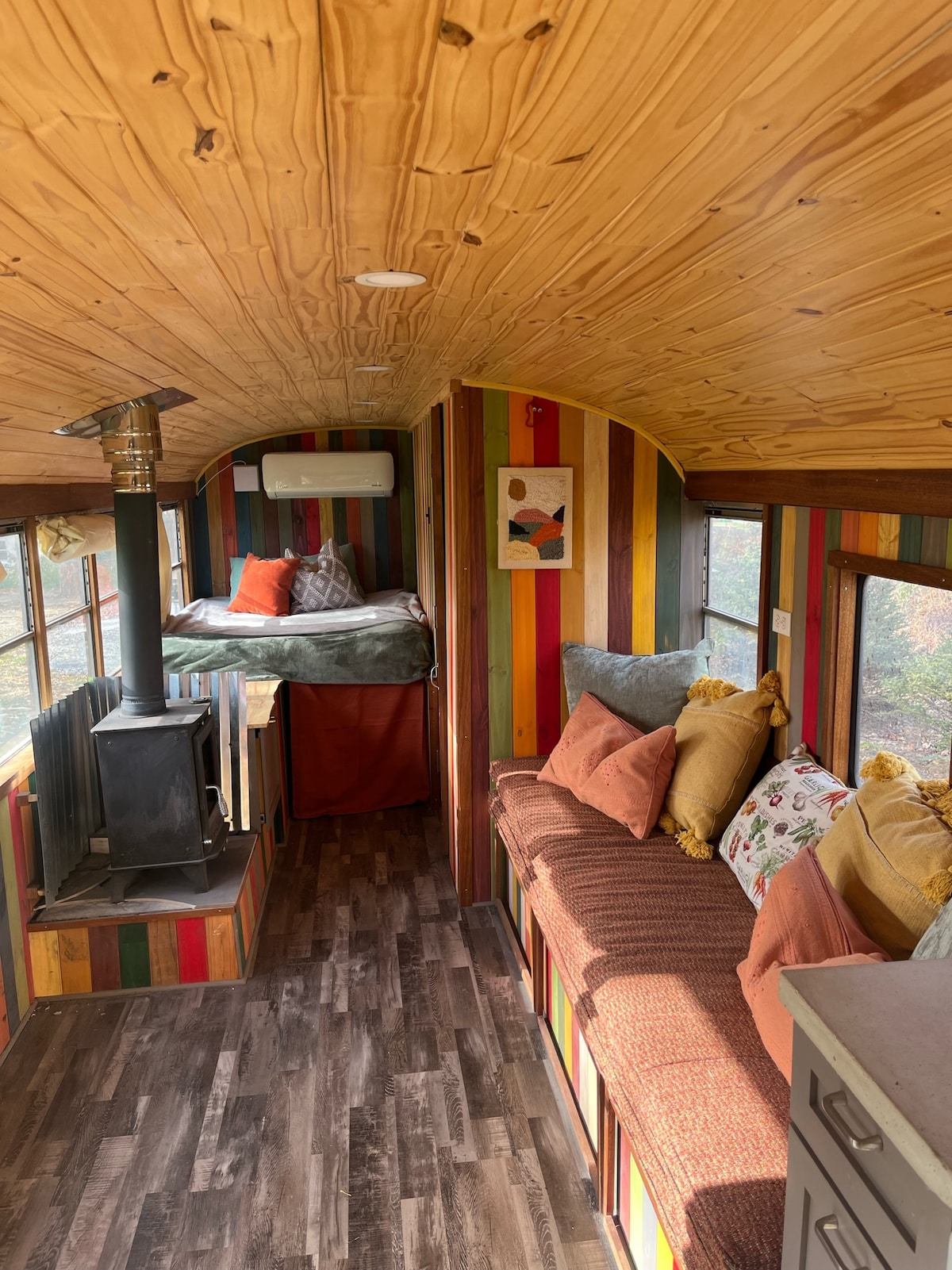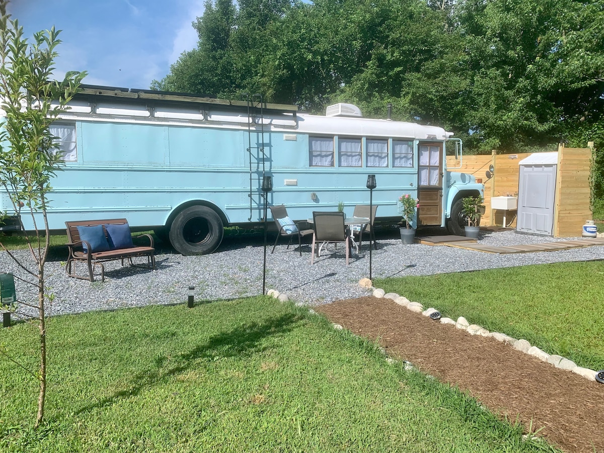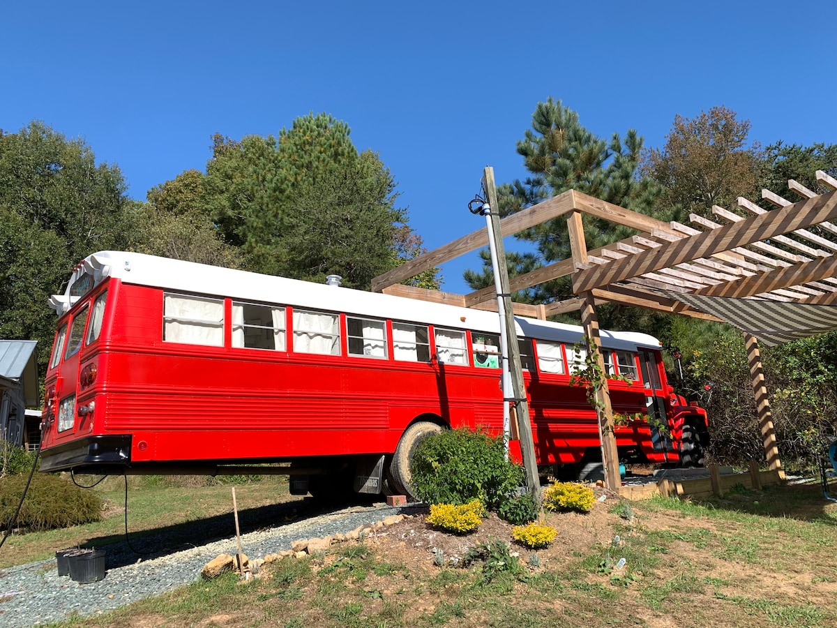 RE-LISTED after property renovations :-). Light filled school bus in country setting. 1 mile from the Village of Saxapahaw located on the Haw River. Queen bed in bedroom & futon couch pulls out to a small double bed. Bus is complete with full kitchen, stove, SMEG fridge, full bath & composting toilet. Quick trip to Saxapahaw for great food at the General Store, The Eddy or Left Bank Butchery; beer at Haw River Ales; coffee at Cup 22; music at the Haw River Ballroom; kayak on the Haw River.