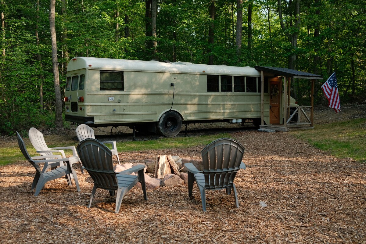 Try tiny living! Come to the Delaware beach for a unique glamping experience. The Coastal Cruiser is a 1985 Thomas School Bus turned tiny home. Spend your days exploring the Delaware Coast and come home to a rustic Skoolie with a full kitchen & outdoor area. You have access to fire pit, grill, and outdoor seating area. We’ve renovated- there is a bunk bed, and a full bathroom with toilet, shower, and sink. The bathroom is in a separate building about 20 ft from the bus.