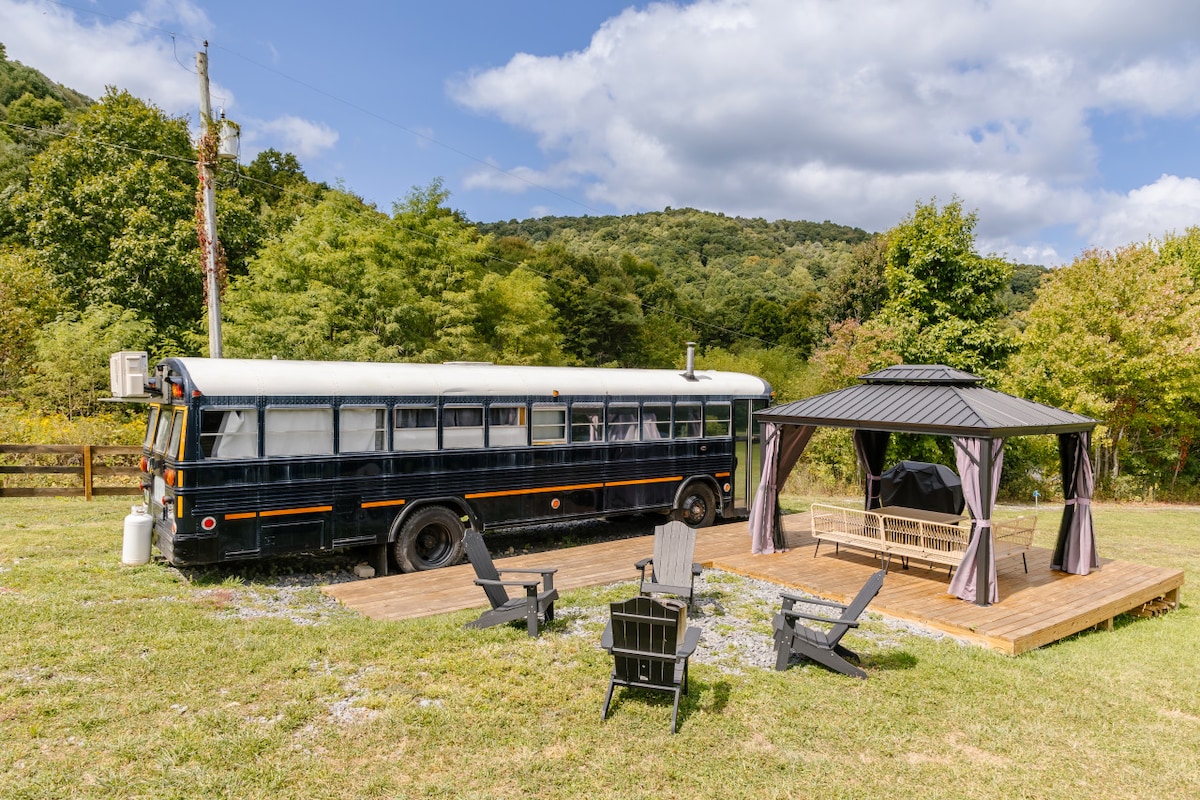 Folks, the bus is leaving, get your ticket now! Relax on our huge deck even in the rain. Watch Netflix on our smart tv during mountain downtime or have your morning java looking out at our peaceful view. This was a school bus, look for yellow paint, now it is an amazing retreat with everything you need for a stay in our Blue Ridge Mountain(s) bus. Enjoy cooking marshmallows in our fire pit or grill out on a lazy afternoon. Drive along the scenic East Fork river just 1000 feet away. REJUVENATE..