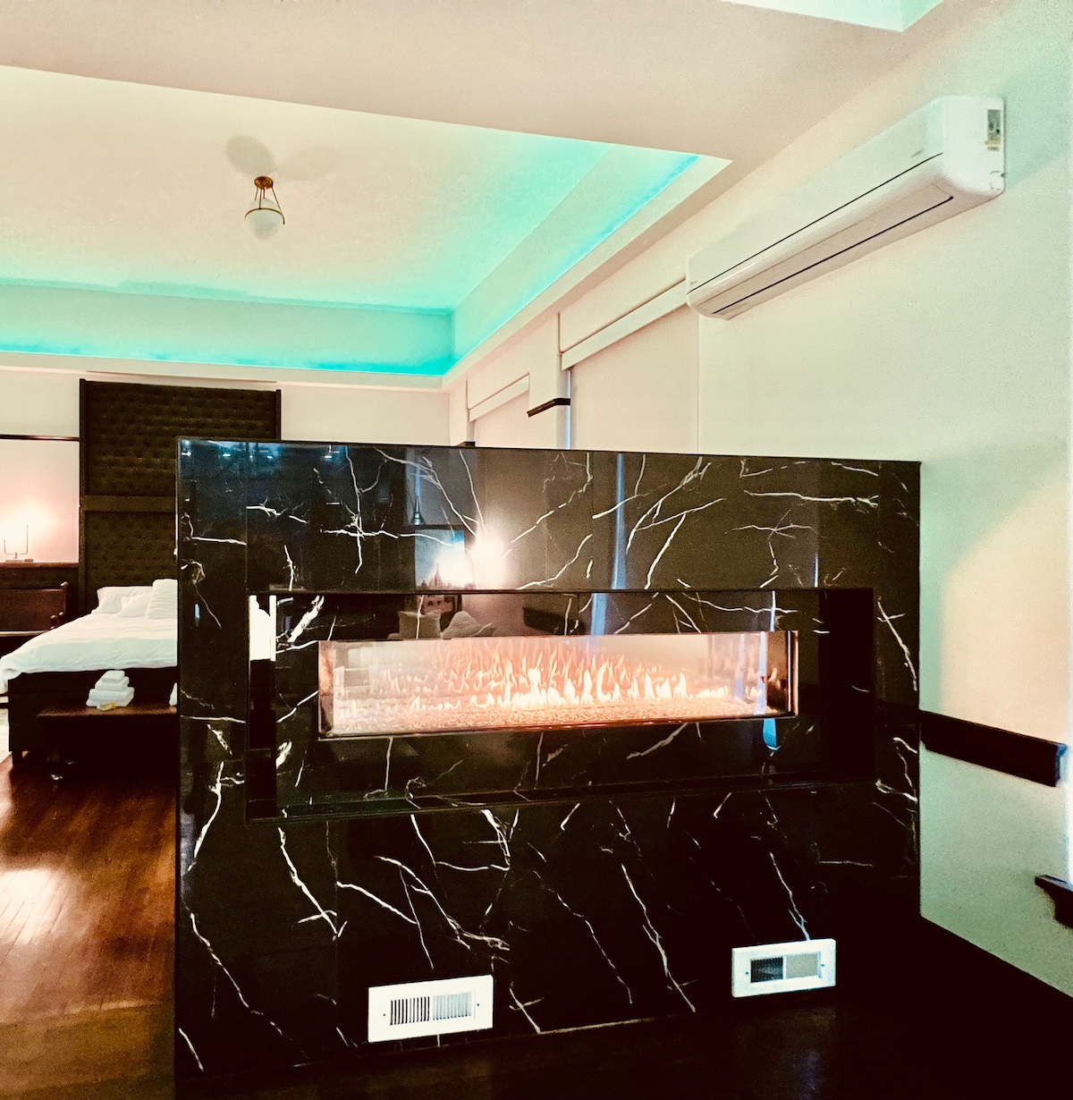Experience the unique luxury! Perfect for family, business, or romantics. With high end finishes, 16' ceilings, a stunning 6' fireplace, this space exudes comfort & elegance. Unwind in the 5' round tub, or enjoy a movie on the 85' smart tv, while appreciating the building's history. For the active guests, an indoor basketball court and gym. Office area for business travellers. Seasonal rooftop area for sunsets or enjoying the weather. Additional bedrooms can be added for larger groups.