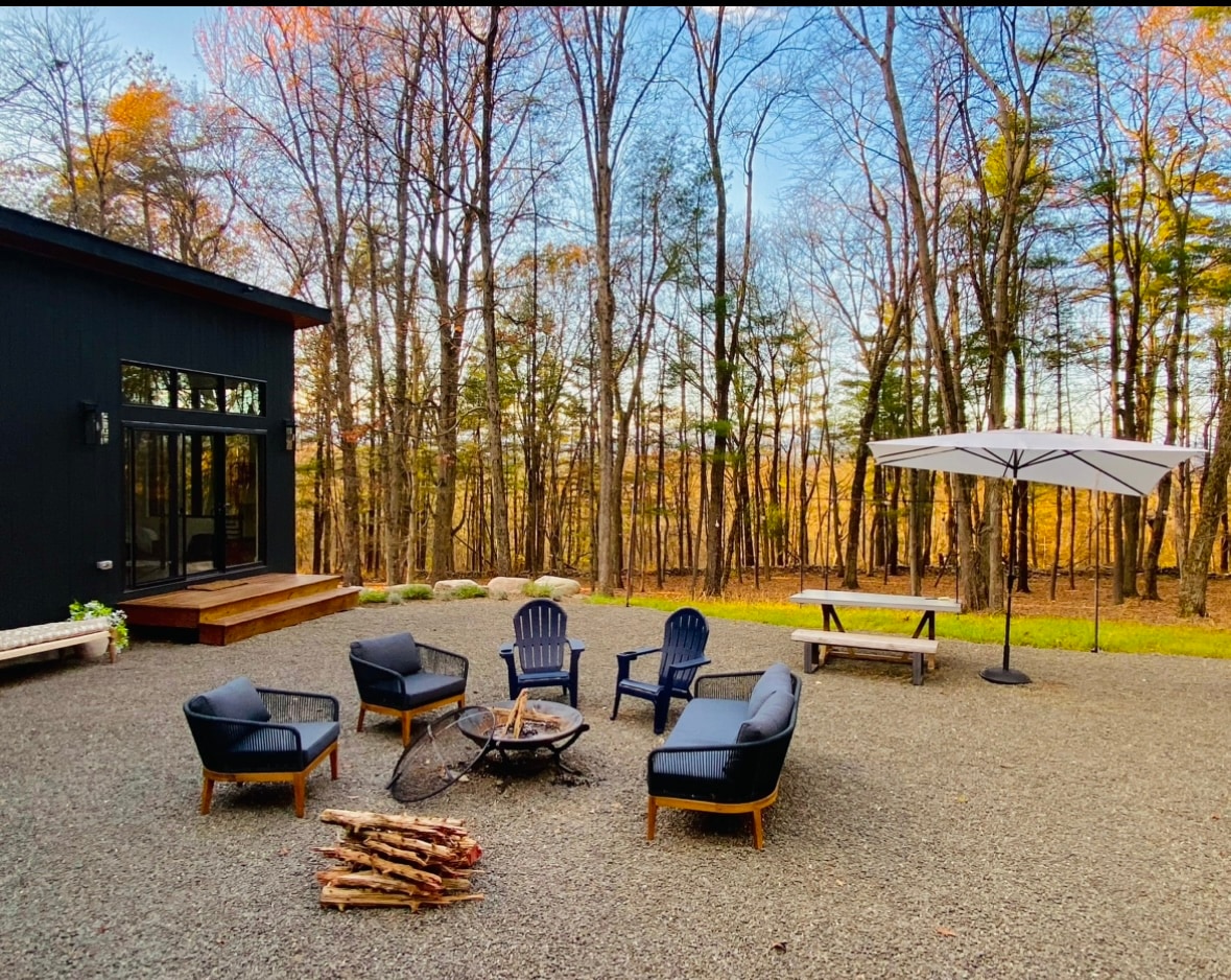 Brand new, luxurious, Frank Lloyd Wright inspired stunner! Situated on several acres nestled beneath Mohonk preserve. Mature pines 🌲provide greenery all year long. What makes 4Arrows special is the thoughtful decor that pays homage to the native peoples of our land. Even in inclement weather you'll bear witness to the majesty of this woodland wonder. A unique "L" shaped design provides a secluded courtyard to unwind and be completely steeped in nature. Come see why we have all 5⭐️ reviews.