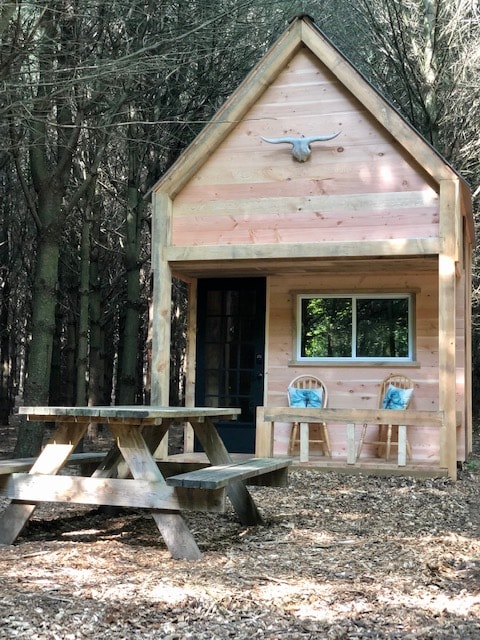 Romantic 4-season off grid cabin tucked away in the pines on our beautiful 50 acre farm. If you are looking for a private getaway and you love farm animals then this is the place for you. The Cabin is a spot to truly unwind and get away from it all. You will hear nothing but the birds and the breeze going true the pine trees. Go for a walk or a bike ride on our trails, or just sit down relax and read a book. This place is magical and peaceful. We are located in beautiful Norfolk County.