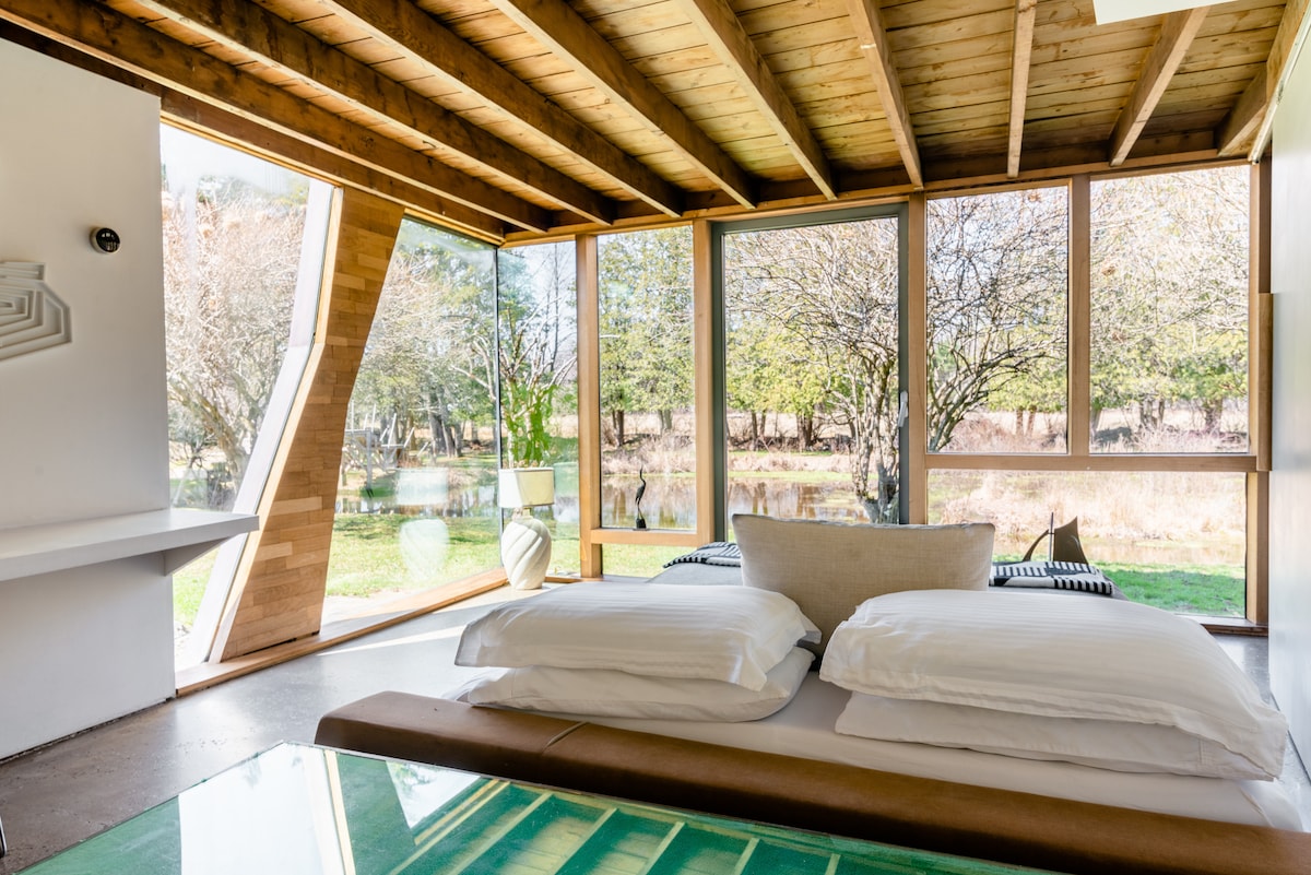 At Stonewall Hill, a modern prefab home set on 10 wooded acres, you can enjoy a cozy night by the fire in winter & cook a feast in the well-equipped kitchen or on the outdoor gas grill in summer. It has an open plan kitchen, living & dining space; a main bedroom w/ queen bed & ensuite bathroom; a 2nd bedroom that doubles as TV room w/ queen sofa bed & bathroom across the hall. 10 minutes to the HITS fairgrounds & close to hiking, skiing, shopping, & dining.