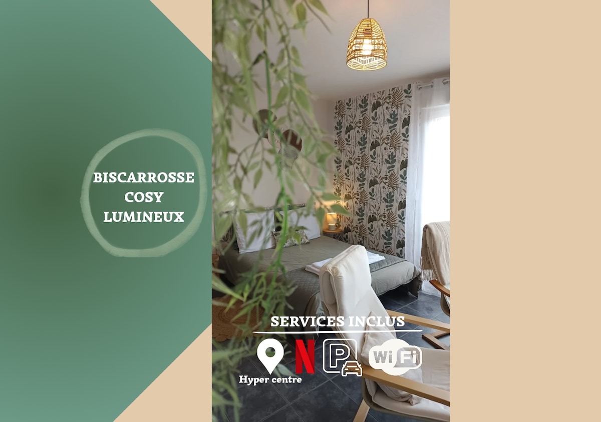 Welcome to Bisca Nest! Brand new apartment, cosy, comfortable and air conditioned, ideally located close to center and in a calm area 300m away from the forest. Ideal for a little family, working profesional, or person wanting to visit the region. Fully equiped, functional and very bright you also have access to a secure and covered shelter (bikes, surfboards…), a parking spot and a pretty little garden for your outside meals. We speak English!