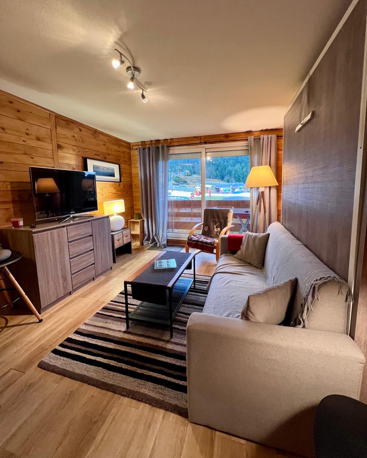 Studio classé 2* au pied des pistes avec balcon plein sud. En plein centre de la station, studio de 32 m2 fonctionnel, entièrement équipé sauf linge de maison, possédant double vitrage et balcon exposé plein sud avec vue imprenable sur les pistes et le Plomb du Cantal : Séjour avec TV écran plat, 2 clic clac 2 personnes. Cuisine équipée, frigo avec congélateur, plaque induction, lave-vaisselle, four, micro-ondes, cafetière, grille-pain, mixeur, raclette. Salle de bain avec douche, lave-linge.