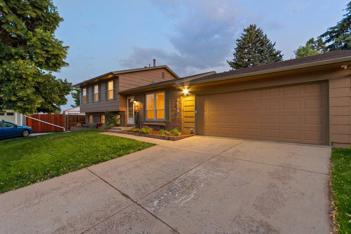Enjoy a blend of city charm & suburban tranquility at our stylish 2-bed/1-bath Aurora home 15min from DIA. Your hosts live onsite, downstairs in a separate garden-level unit. Highlights: • Chef's kitchen & formal dining room • Spacious 1400 sq ft living area • Dedicated workspace & printer • Pet-Friendly: Shared Fenced backyard Nestled in a quiet neighborhood close to shopping centers, parks & golf courses; An ideal spot to explore Denver or to stay near the Anschutz Medical Campus Hospitals.