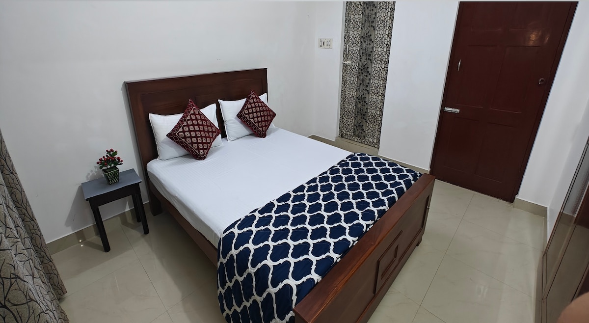 Completely Private with no sharing of any space, One Studio Room Small Apartment with a slab for kitchen & attached bathroom. New AC, cupboard, Queen bed with orthofoam mattress, ideal for two guests. kitchen area contains induction for cooking with utensils and cooking vessels. Hi-speed Internet connection for work from home Google TV with all Apps, AC, Fridge, Oven, Geyser, chairs, iron, etc, everything is there. Fully entilated place with 2 big windows. We need ID proof of all guests.