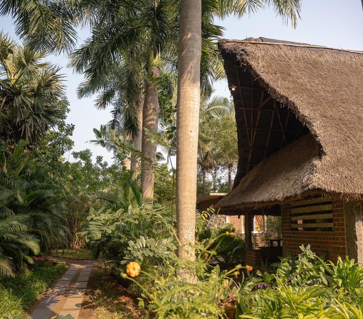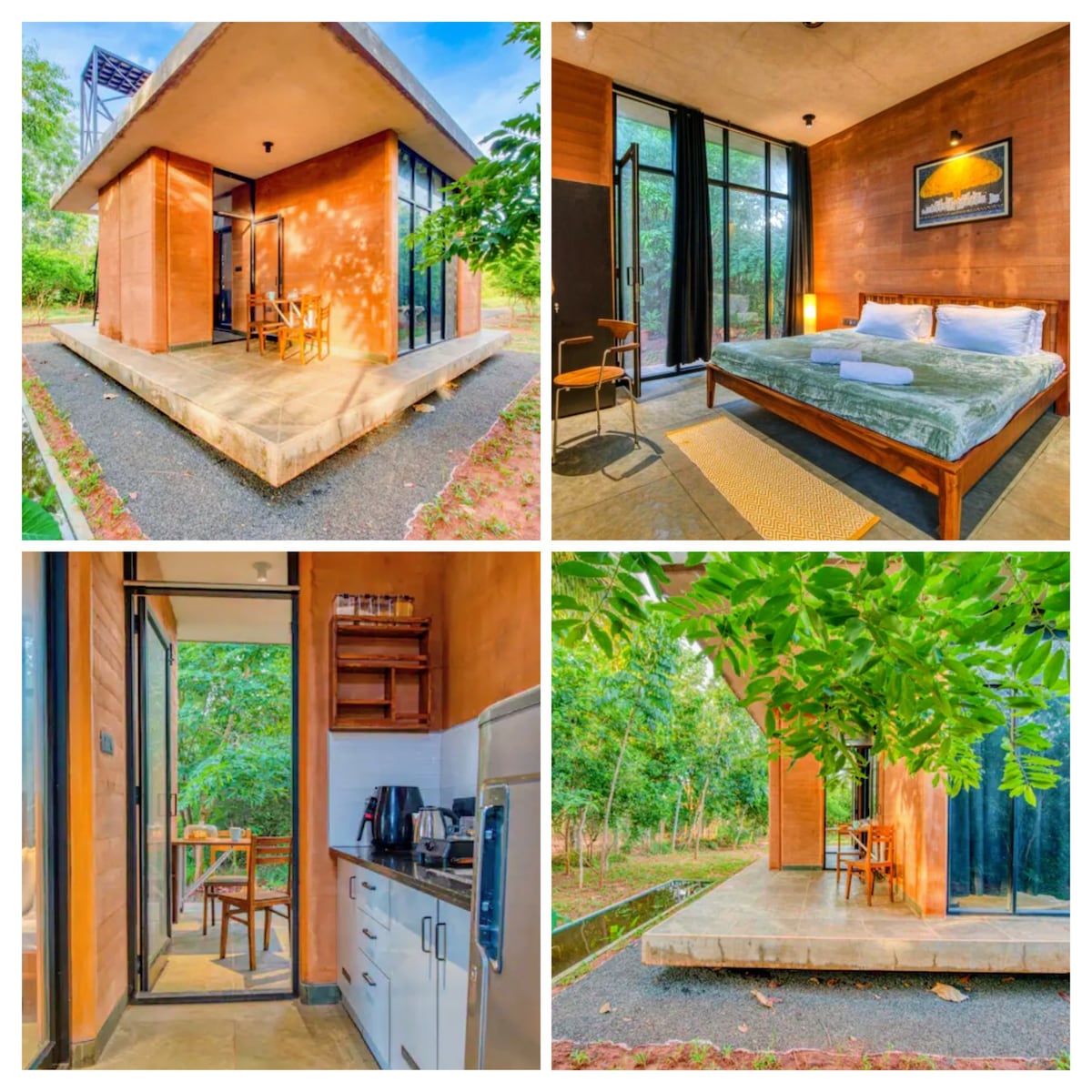 The earthen hut, located amidst the cashew orchard, is a unique pioneer-style hut made of wood, mud, and coconut leaves, using completely sustainable materials. It features a curated open-hut design surrounded by lush greenery, offering guests a unique living experience. The hut includes a kitchen, a separate standalone bathroom, and a pebble-paved patio with seating areas for enjoying coffee! The best corner is the balcony, which offers the guest to witness the sunset, sunrise and stargazing.