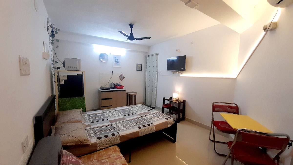 This modern, cozy and fully equipped 1 BHK apartment is located in the heart of Pondicherry. The apartment is surrounded by restaurants, grocery stores, bakeries and Boutiques. The bedroom has a king size bed with an attached bathroom, and the living room comprising of a sofa cum bed that can sleep 1 additional person. The modern kitchen is equipped with a fridge, gas stove, microwave, electric kettle, toaster, drinking water purifier washing Machine and required utensils.