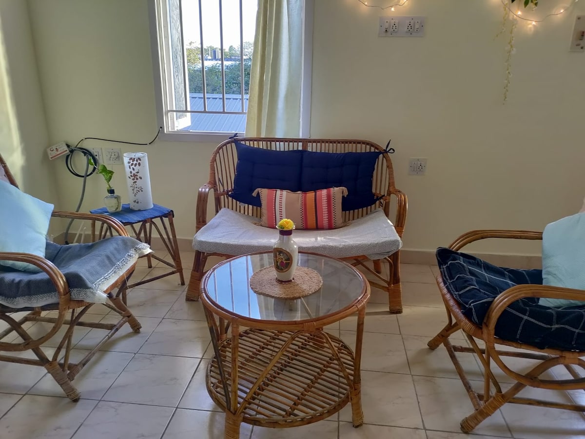 Welcome to Oorvi, a charming getaway! Nestled right in between Auroville and Pondicherry, this cozy one-bedroom apartment offers a perfect blend of comfort and nature, yet close to local amenities. Every detail in this space has been thoughtfully curated to create a warm and serene atmosphere. Wake up to the sounds of birdsong and life of the nearby village. Ideal for solo travelers, couples, or anyone looking for a unwinding and purposeful stay!