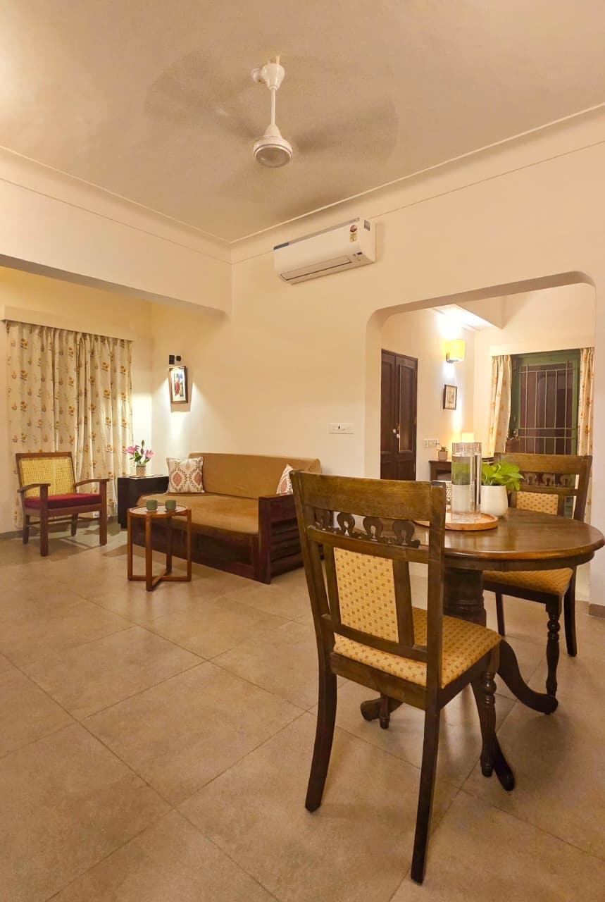 Entire ground floor of a 2 floored home. A serene property surrounded by lush greenery; well-lit and ventilated rooms; common space with large French windows. Enjoy the breeze and amazing view from the vast sit out and terrace spaces. Very good wifi facilitating work from home, book collection, board games and other engaging amenities to have a good time. Auroville beach and Serenity beach at a walkable distance (500m). Both beaches are ideal getaways for surfing, kayaking and fishing.