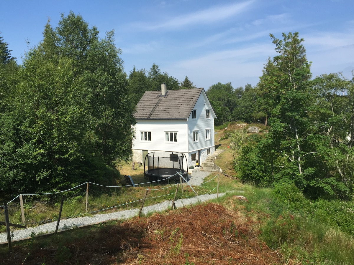 Familievennlig enebolig med utsikt mot sjøen. Stor solrik hage med boblebad. 8 sengeplasser. Kan skaffe ekstra soveplasser ved behov. Innholdsrik hage med terasse, trampoline, sandkasse, lekehus, fotballmål og hengekøye. Lekeplass rett ved huset. 5 min å gå ned til sjøen. Gode turmuligheter. Vi har masse leker, bøker spill, PlayStation, klatrevegg for barna på loftet. Panorama Hotell og resort ligger 5 min unna. Her er mulighet for utleie av båt, kajakk, badestrand og fiskemuligheter.