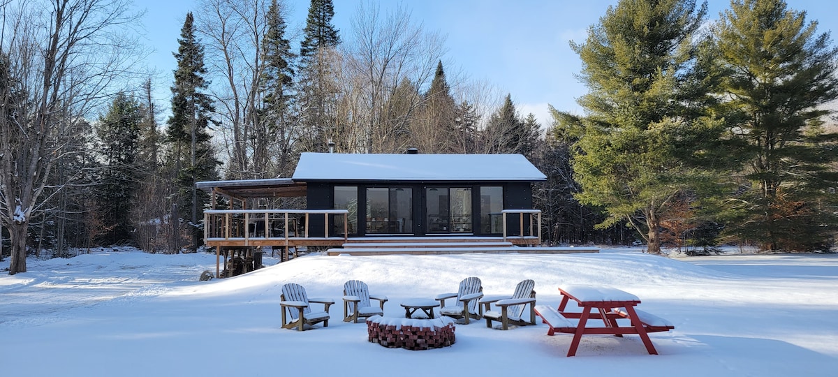 *$* WINTER PROMOTION *$* For a weekend reservation (Fri. & Sat.) the 3rd night on Sunday is $90.00!. Monumental open concept, in the heart of nature. Access to trails directly behind the house. Wood stove, large modern bathroom, one bedroom + sofa bed. Another sofa bed in the living room. Ideal chalet for a couple with children or two couples. Wild birds, turkey, and deer lovers welcome! Wifi and EV charger included. Dogs Welcome! CITQ : #308038
