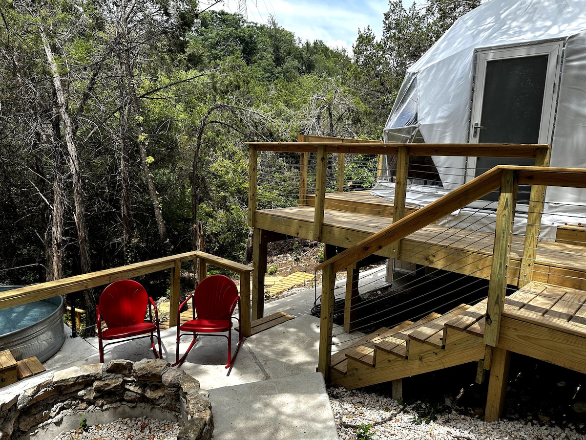 Escape to our dome away from home! A unique haven at Lake Travis. Nestled in a serene canyon on 2 acres, you'll enjoy privacy, a spring-fed creek, and proximity to Austin (25 min). Relax in a heated Texas-style cowboy pool, enjoy starlit fires, a luxurious bathroom, and a streaming creek in an oasis of calm yet close to conveniences (groceries and restaurants 3 mins away). The location is very private.
