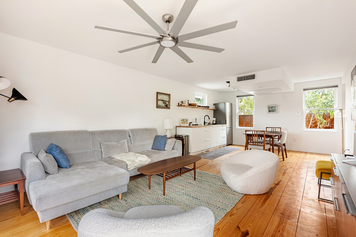Discover a space to unwind while being close to all the action. Featuring a spacious open-plan living area, cozy furnishings, an upstairs loft bedroom (with downstairs sofa bed), a screened-in porch, and a tree-covered BBQ patio area. Guests love to stretch out on our shaded deck or walk to the best restaurants and coffee shops in the famous SOCO neighborhood. Read our reviews… your search stops here!