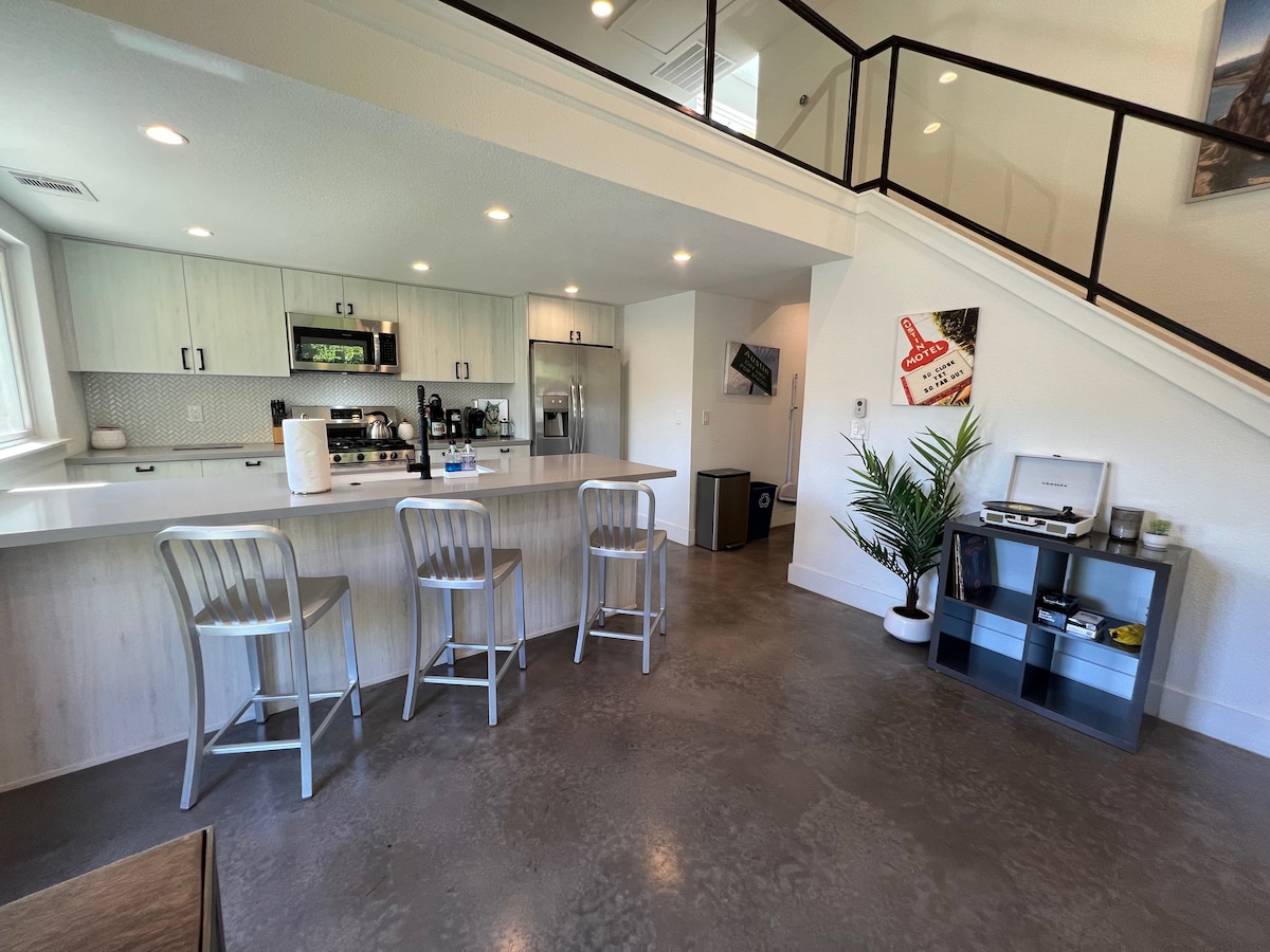 Newly constructed in 2019, take in treetop views from the loft nest overlooking interesting architectural lines and a cleverly designed open kitchen-living space. This entire house with private, dedicated access allows you to come and go easily. We provide luxury linens, a sparkling clean house and all the amenities of home. We're located steps from the popular restaurants and shopping of South Congress! Please note: you must climb a spiral staircase to get to the guest house. The second bed is in a loft accessible with a ladder. You need solid mobility. This guest house was completed in 2019 and is perched above a spiral staircase to get to the main floor. You will also need to climb a loft ladder to utilize the second queen bed in the loft so we do want to make sure you're aware and comfortable doing so. The house has tons of natural light, high end furnishings and 20 foot vaulted ceilings! It was designed and built for guests to have all the amenities like luxurious bedding and fixtures right in the heart of classics like Guero's, The Continental Club, Hopdoddy's, Home Slice and more! The dedicated outdoor porch lets you start your day with a coffee from the in-unit Nespresso or Mañana, the coffee shop right next door. You can enjoy live music during the weekends at multiple spots nearby! You'll have access to the entire guest suite and dedicated porch with outdoor seating. This is a completely separate guest house and so you have fully private and separate entrance. Aside from normal workdays we're often available in person but we are always just a text or message away! Come and go easily with private access to this inviting Travis Heights guesthouse. The lively South Congress commercial area, the Rainey Street Historic District, quiet tree-lined streets great for walking, and the downtown area are all just minutes away. The dedicated outdoor porch lets you start your day with a coffee from the in-unit N-espresso or Manana, the coffee shop right next door. You can enjoy live music at the weekend at multiple spots nearby and lovely local shopping! Uber and Lyft are staples of transportation in Austin as well as scooters and bikes that you can pick up on the sidewalk. We are on an express bus line as well that can take you near and far. You're in the heart of it all and it's easy to get around. We also offer 1 on-site parking space if you choose to rent or drive in your own car. The hotel next door is a popular venue for events that take place often on Thursday, Friday and Saturday. This means there could be loud, live music for weddings and events. It ends by 11 pm on the weekends but be aware if you'd be disturbed by it. We love the energy it brings but it's not for everyone.