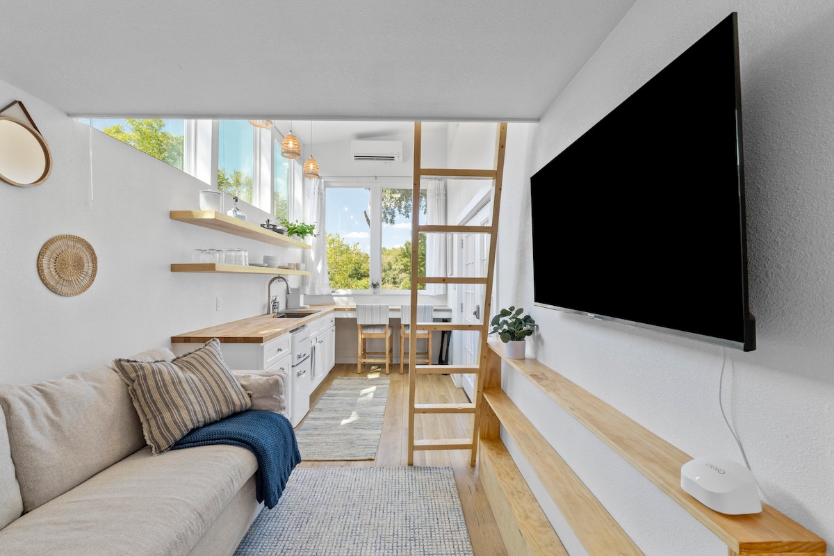This tiny home was lovingly designed by an artist during quarantine, and now you can step into her world! Enjoy the photo books, take a soak in the extra-deep tub, or gaze out the window up in the loft. This is a calm, cottagecore oasis situated in the Hyde Park neighborhood, a five minute walk from Shipe Park and pool, Quack’s Bakery, Julio’s Tex Max, Hyde Park Grill, Juiceland and Antonelli’s Cheese Shop. If you’re into highly organized spaces and library ladders, you’ve found the right spot!