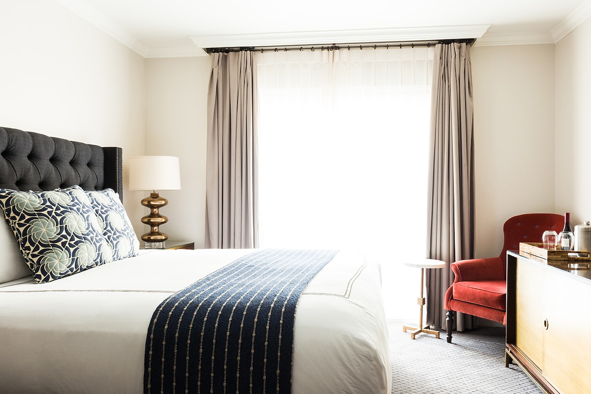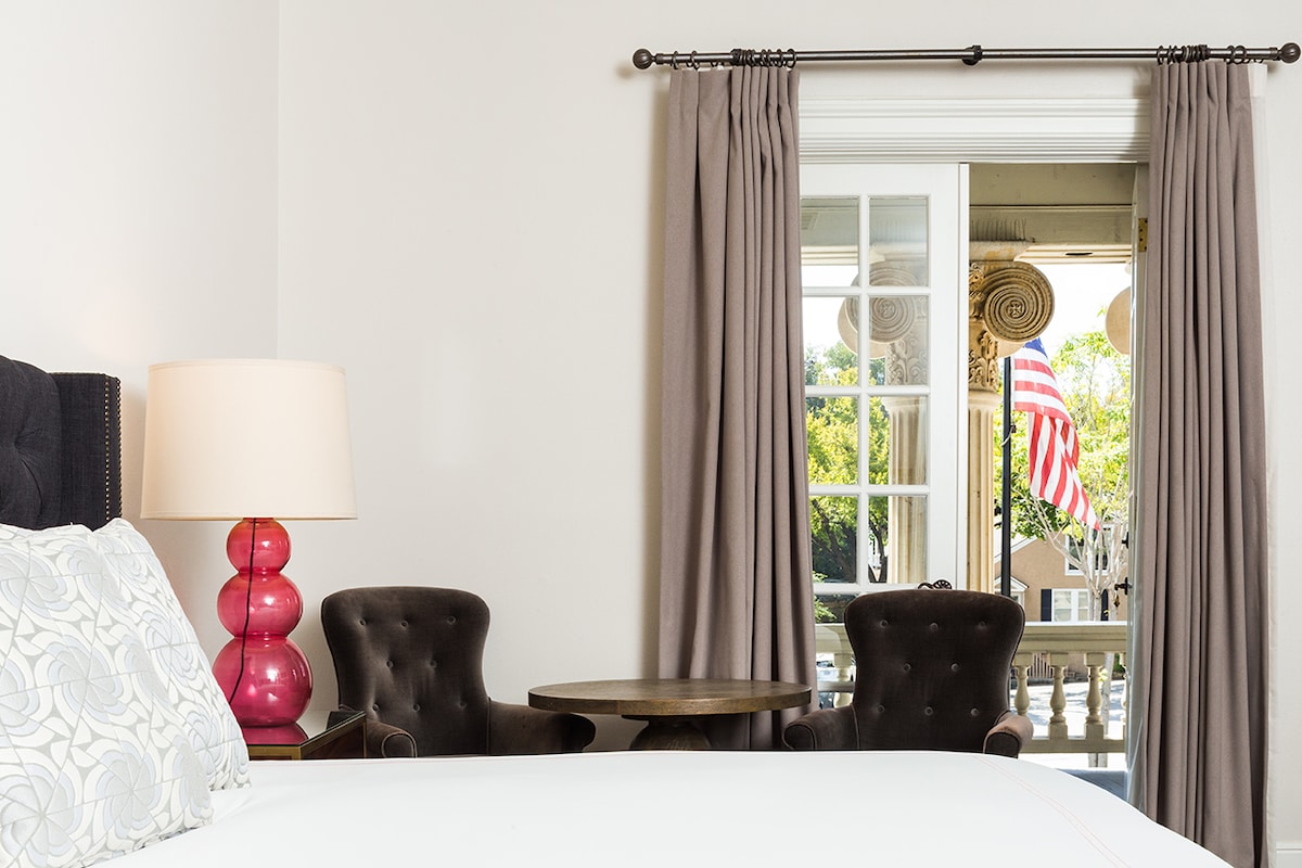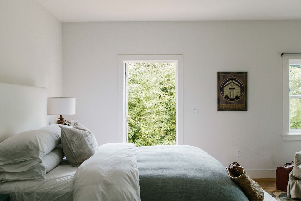 Seven captures the best of the day's sunlight through windows on all sides. Sleep comfortably in a queen bed under organic cotton sheets and aPom Pom at Home linen fringed throw. Next to the bed is a Quatrine chaise lounge, plus a writing desk and a private back patio. The spacious bathroom has a combination of shower/tub, organic cotton towels, and San Saba Co. hair and body products. Amenities include coffee maker, mini-fridge, mirror, hair dryer, steamer, WiFi, 14" TV with Sling.