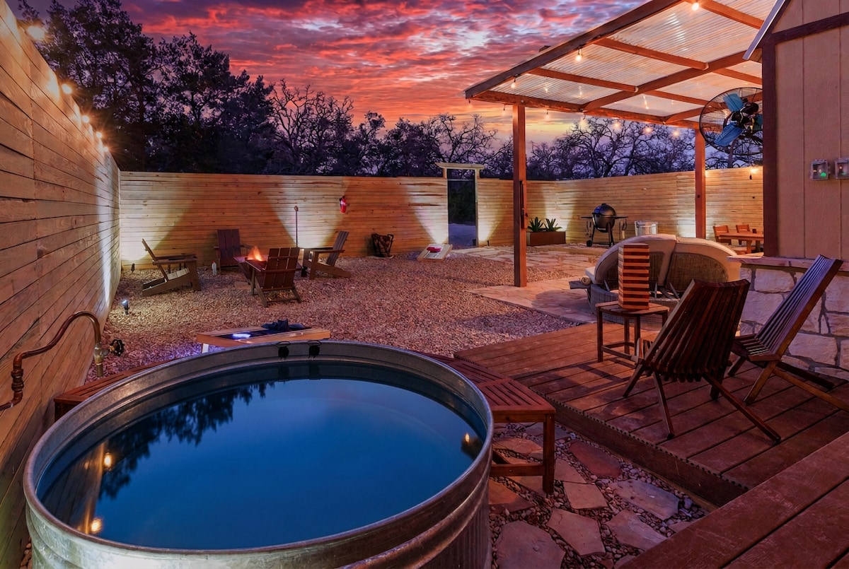 Welcome to Bee Creek Cottage — a stylish, modern escape nestled in Texas Hill Country. Perfect for couples, small groups, or bridal stays, this private oasis offers nature views, elegant interiors, and easy access to wineries & Austin. 🌊 Private deck with hot tub 🔥 Fire pit with Adirondack chairs & hill country views 🕹️ Shared Game Room 🎨 Access to on-site art gallery & walking trails 🍷 Minutes from Texas wineries, BBQ & Lake Travis