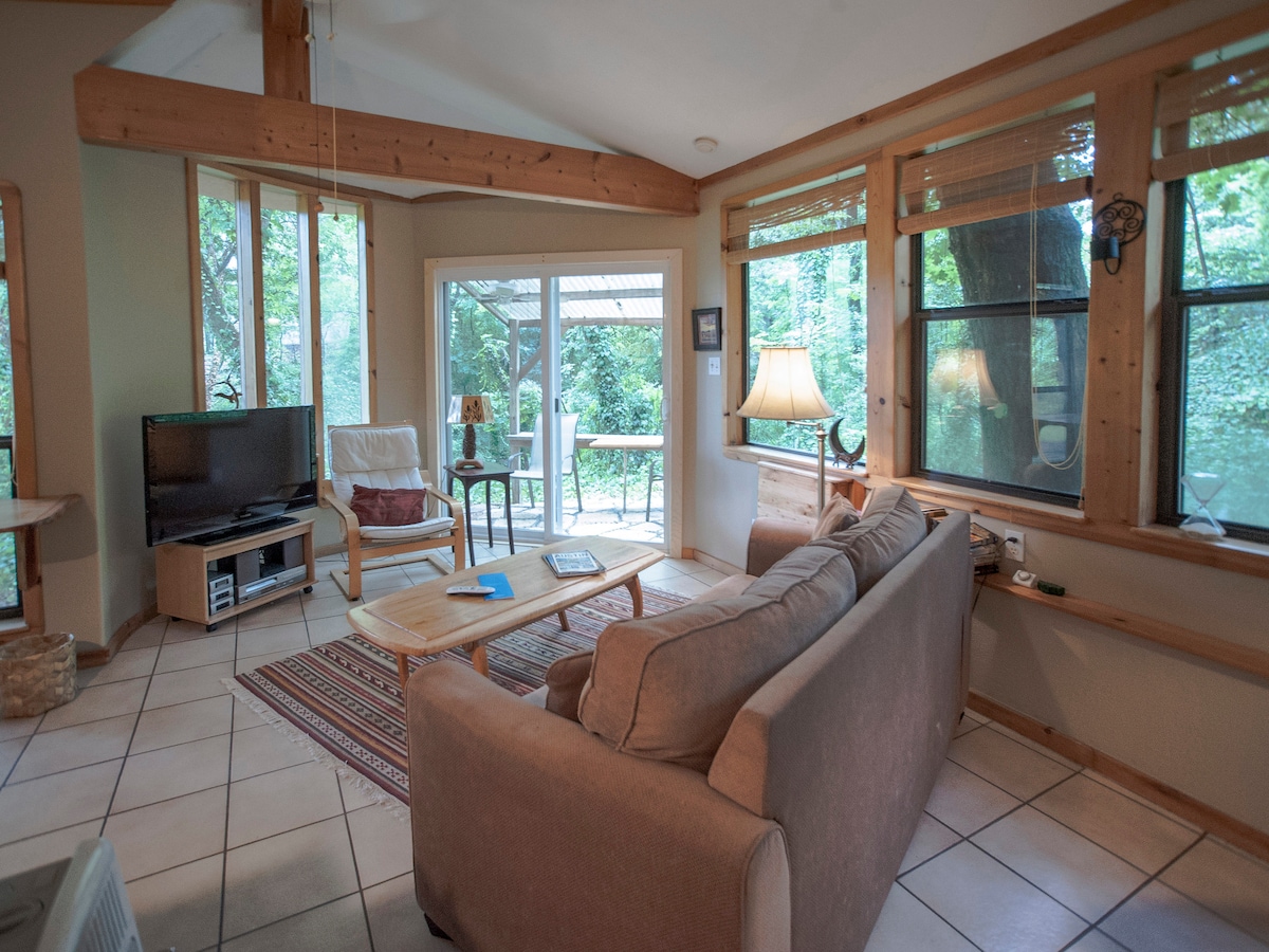 Treat yourself to a stay at this rustic chic 900 sq ft A-frame home and get away from it all for a while! The interior is just as charming as the exterior with tall vaulted ceilings, natural wood throughout, and a newly renovated bathroom and kitchen. The wall of windows will lead you to the spacious deck where you will be surrounded by tall trees and beautiful sounds of nature.