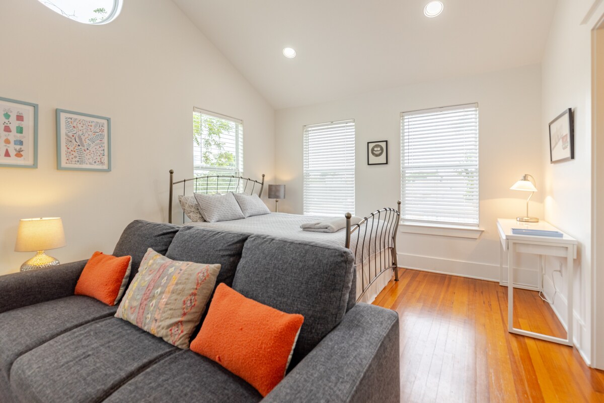 This is a trendy, comfortable and convenient guesthouse for spending a fun-filled getaway in East Austin. Our casita is walkable to many of Austin’s hottest spots, including the Moody Center: Austin’s largest music venue. Built in 2020, our guesthouse features a lofted queen-sized bed, a couch with a pull-out twin mattress, an elegant walk-in shower, smart TV, and small appliances including fridge-freezer, microwave, and Nespresso coffee maker. Relax in style as you explore our fun city!