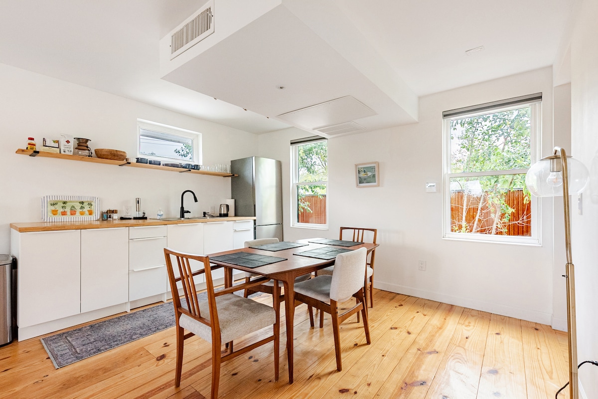 Howdy. Welcome to Casa Plata, a modern casita with a cool Austin aesthetic. The guesthouse is located in a chill, highly-walkable, residential pocket within East Austin's 11th & 12th Entertainment Districts, known for their nationally acclaimed restaurants, lounges and hotspots. Filled with light and surrounded by a canopy of trees, this second floor guesthouse comfortably accommodates four. Sip a latte on the deck and enjoy the the warm Texas sun 🌞.