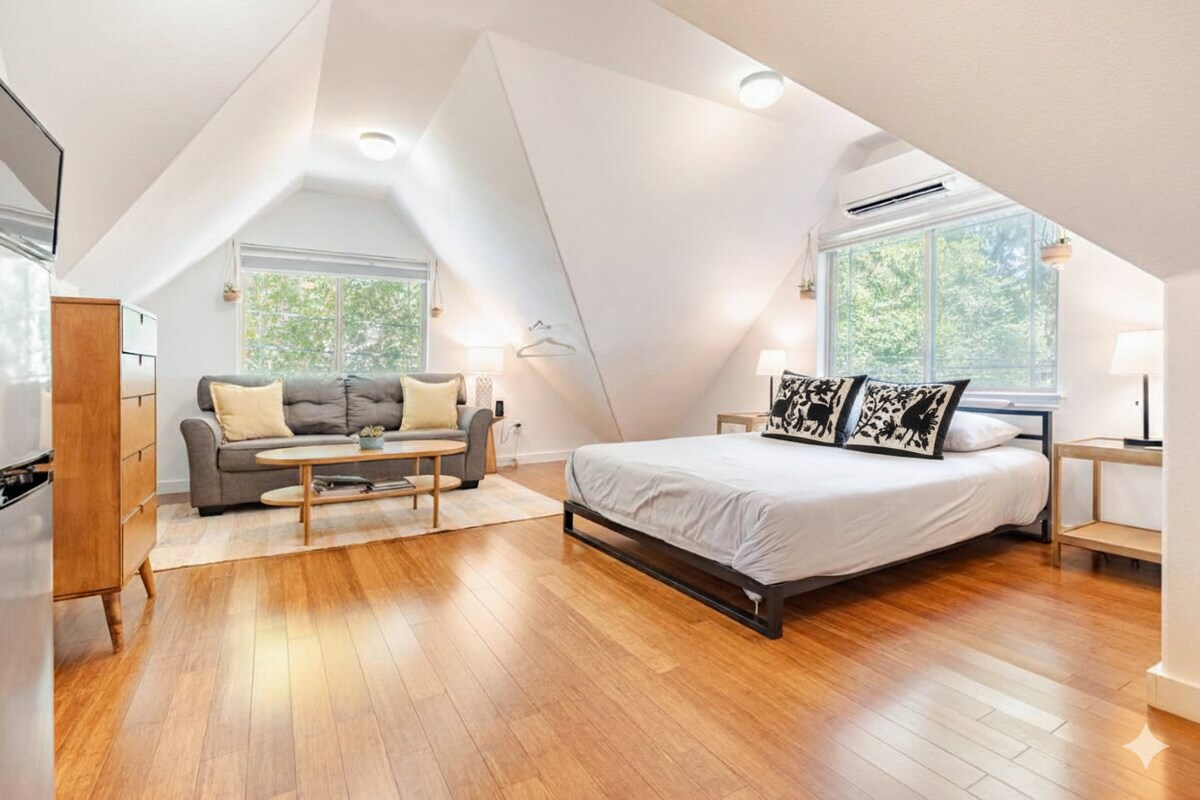 Escape to this private studio, detached from our main home. The Lady Bird Lake hike & bike trail is right outside, where you can use our bikes, paddleboards, and kayaks. Open the blackout cellular shades to feel suspended among the trees & see Monk parakeets, and many other birds. This studio makes excellent use of the space above our 2-car garage with an elegant bathroom, organic mattress, & butcher block countertops. 2G Google Fiber wifi It's tight for 3 or 4 people.