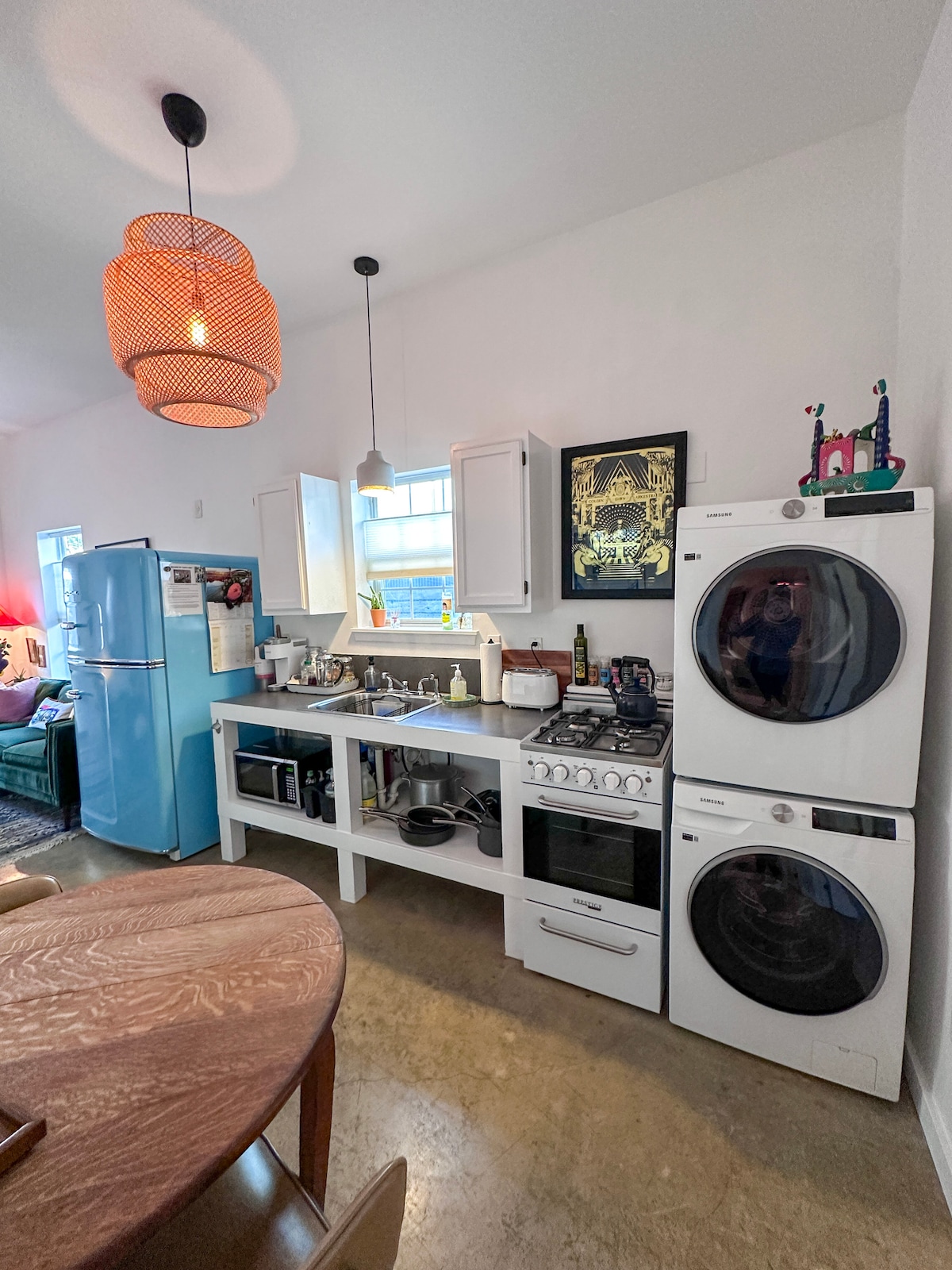 New guest house built in back of main house accessible by the back alley. Close to South Congress shopping area. Its completely separate from the front house , has one bedroom and a full bath downstairs with a full kitchen and living room upstairs. The kitchen has a combination microwave / convection oven and a two burner electric induction hot plate in the cabinets. All kitchen utensils , pots and pans, drip coffe maker , and electric kettle Are included in the kitchen. Pets under 25 lbs.