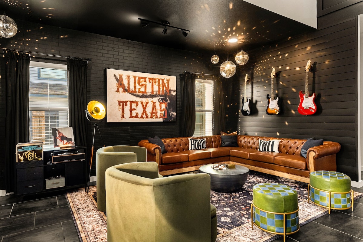 ✨Timeless-Texas-Inn✨ • An Expansive backyard now with Mini⛳Golf! - 🔥Heated Pool 🌊 - BBQ & a ton of games for ultimate Texan fun! • At night, the backyard glows with café lights -🔥fire pits - & a stunning gazebo, radiating TIMELESS décor & charm. • NEW MOVIE 🎦THEATER🍿ROOM - 🎮Game room - 🎱Pool table - 🎯Darts - Arcades & Board games - creating the ideal space for groups to make lasting memories in a picture-perfect setting! • 8min to KALAHARI • 12min to Domain • 20min to AUSTIN 🎸🎶