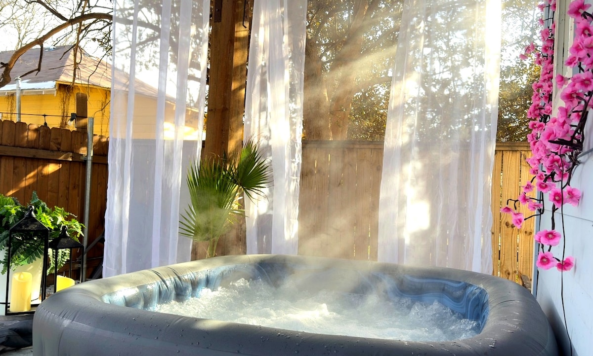 *Sauna and Cold Plunge are available to guests for an extra cost* Enjoy this beautifully remodeled guest house located close to everything Austin has to offer. 10 minutes from Downtown and the Domain. Our guest house has a hot tub with lights and Bluetooth speakers nestled under majestic oak trees in a beautiful garden. Please join us and enjoy! The guesthouse has a bathroom, refrigerator, microwave, wifi, TV with all the streaming apps, working space/dining table, and air conditioning!