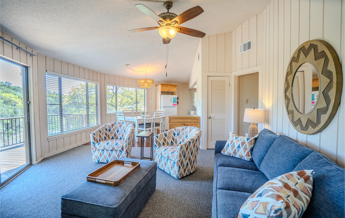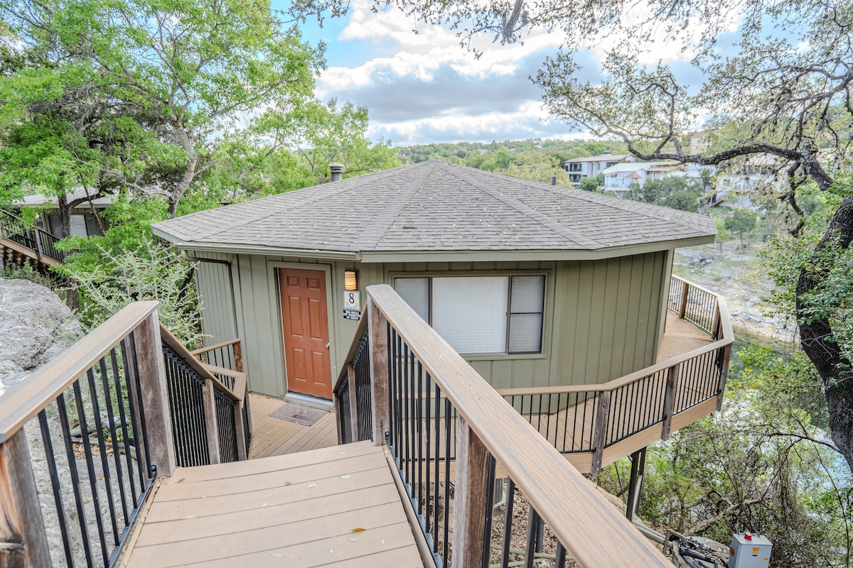 Waterfront top floor villa with deep water views from large patio, living room and bedroom. Daily deer encounters. Watch sunsets on Lake Travis' private island. Stand up shower, jacuzzi tub, washer/dryer, weekend salon/spa, restaurant, 3 pools (indoor is closed) , hot tubs, saunas, elevator access, fitness center, shuffleboard, WiFi, pickleball and tennis. Max 4 guests, including infants and children. 21+ to book. More villas available for family. Nice people only! 😊