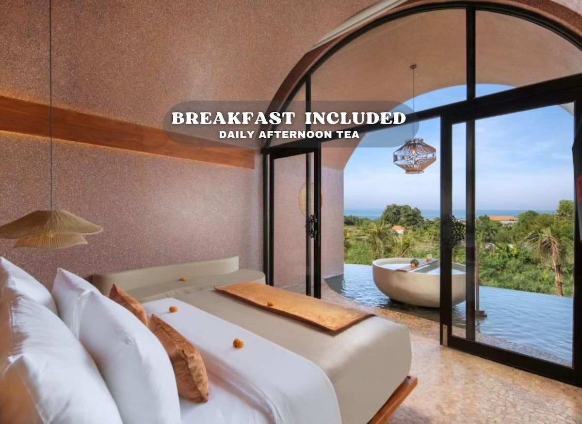 One of our most sought-after rooms, this dreamy 1-bedroom features a king bed, semi open-air ensuite, private balcony, and outdoor living space. Located opposite the pool, it offers resort pool views and a glimpse of the ocean. Designed with flair and authenticity, it’s set on the most peaceful side of Nusa Lembongan—just a 3-minute walk to two beaches : Coconut and Tamarind beach. Daily breakfast included at on-site plant based restaurant The Playful Table.