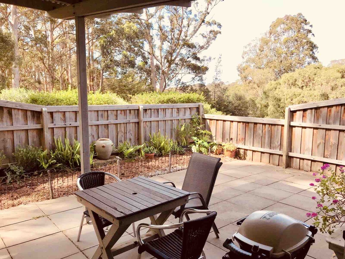 Enjoy your self contained studio to all to yourselves, located on a beautiful peaceful 2.5 acres on the edge of town, a special authentic Margaret River holiday, nature walks from your front door step, see kangaroos and wonderful bird life plus be minutes away from beaches or town with a convenient 11am checkout. The spacious king bedroom opens to a open plan lounge, dining, kitchen with forest views from your verandah. Enjoy an evening bath under the stars. (Note-wood fire not in use)