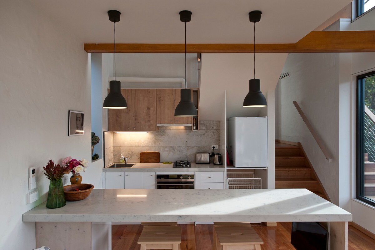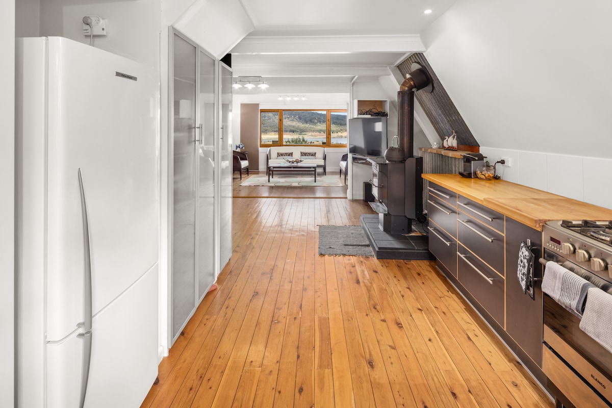 Pipeline Chalet kunanyi / Mt Wellington is an architect designed residence, with privacy and a spectacular mountain environment on your doorstep, just 15 minutes from Hobart's CBD. The kitchen has stone benches with stools and a gas cooktop with all the utensils to cook up a hearty meal. A king bed in the mezannine and a sofa bed in the lounge sleeps 4. There is a smart TV with WiFi included, with forest and nature immediately outside and a sun drenched outdoor living space.