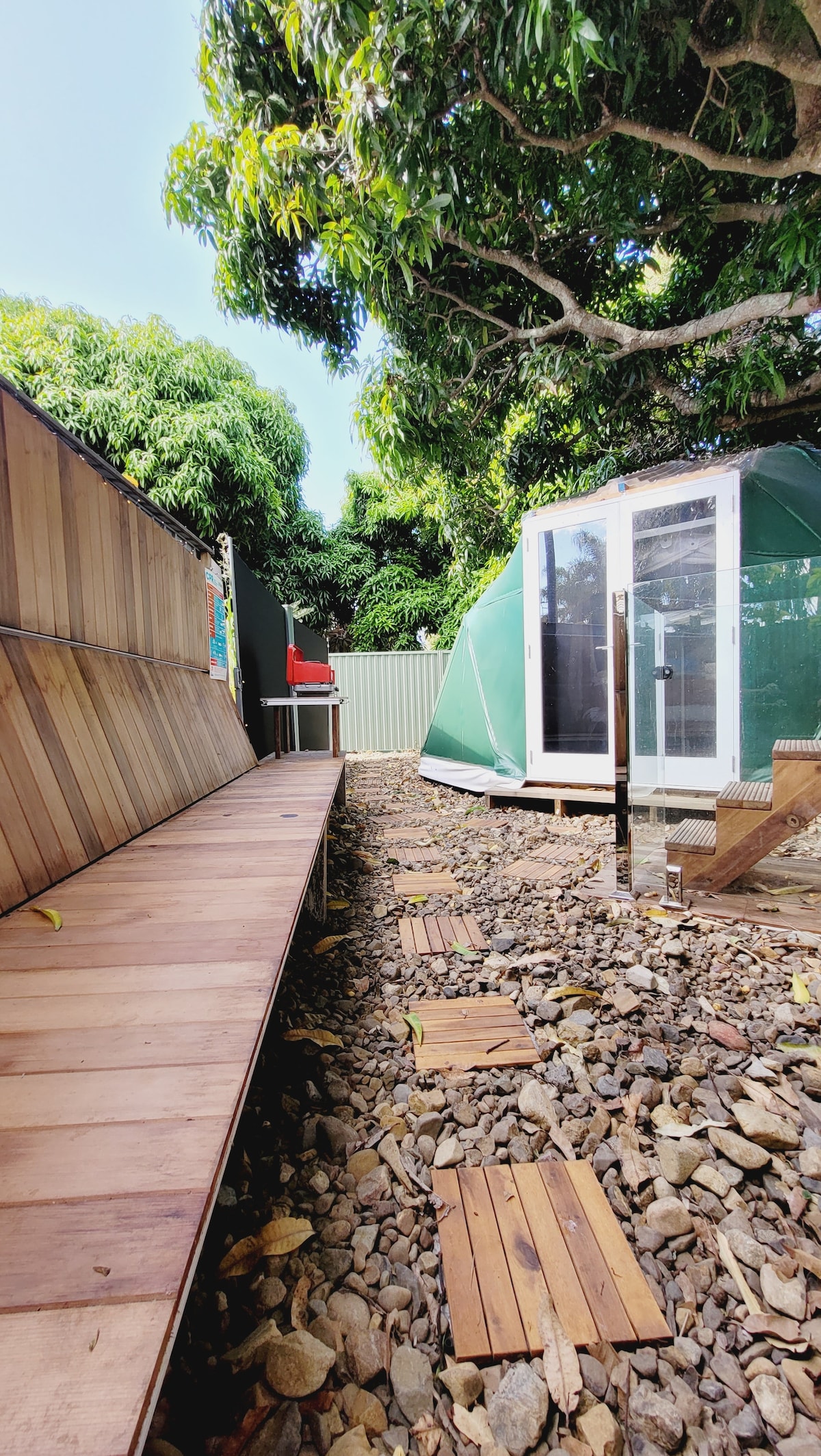 Let Mangodala Geodesic Dome take you away to a magical oasis in Scarborough. 30mins from Brisbane, 25mins from the airport and 3mins from Newport Marina to book a day trip to Moreton Island. Eco minded recycled timber structure, cotton canvas exterior and natural fibre linen. Relax and unwind in your private cedar hot tub, enjoy tranquil outdoor gardens and entertaining area with BBQ and fire pit all nestled under a magnificent Mango tree. Kitchen, bathroom and lounge inside the Dome.