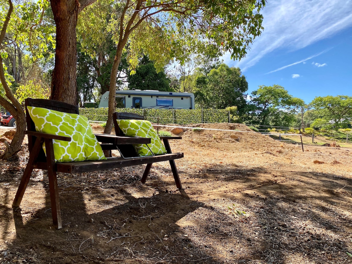 Spacious very comfortable modern caravan, black and white decor, with all modern conveniences including TV, aircon, toilet, shower, washing machine and full kitchen with stove, microwave, and a large fridge. Set in a peaceful rural setting with table and chairs to sit on outside . Outdoor bbq also available. Set amongst gum trees. Close to shops. Independent living. 20 minutes drive from the city centre, 3 minutes drive to a large shopping centre.