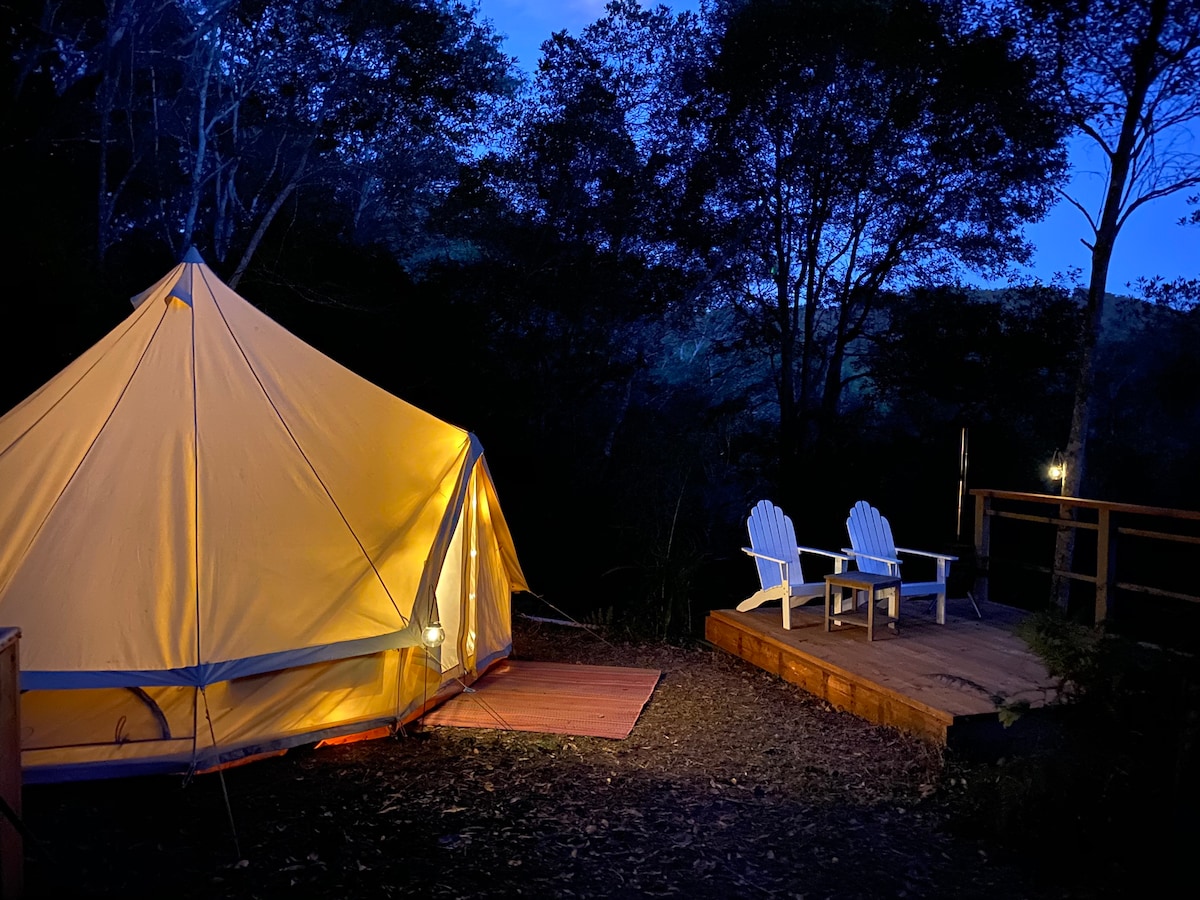 The large safari style tent is spacious and includes a queen bed, seating and plenty of room to move around. It has a unique star gazing roof to maximise your experience! The Tent is situated in it's own area of the garden with direct views across the creek to Gulaga mountain and a personal fire pit for relaxing evenings. Amenities are a short walk and include a most surprising best camp kitchen and lounging area including wifi, BBQ, fridging and TV. Pets are welcome.