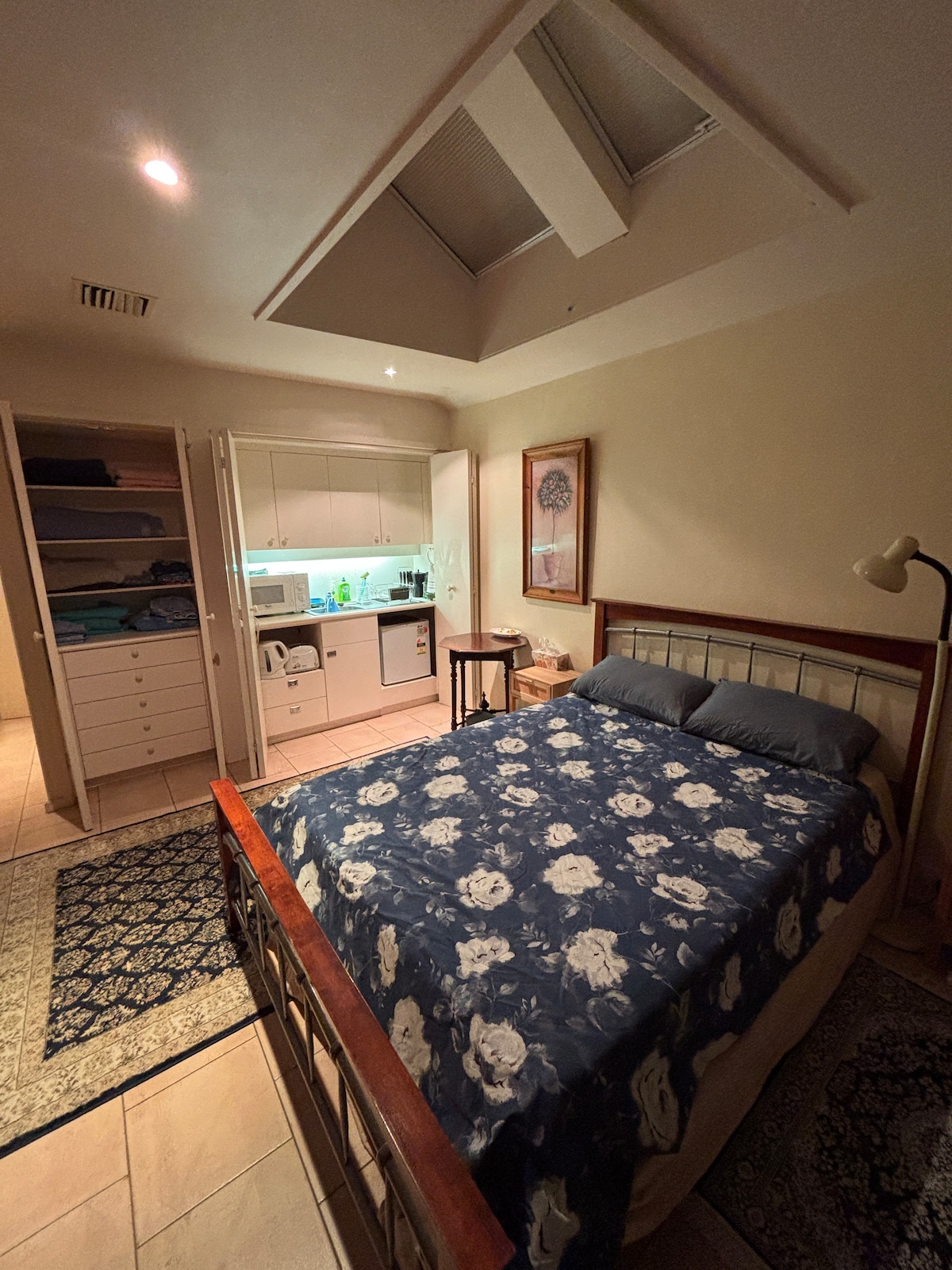 Located in Narrabundah, this spacious studio offers a tranquil retreat. With high ceilings & bi-fold doors opening up to a stunning garden, the room is bathed in natural light and provides a seamless indoor-outdoor living experience. Complete with a comfy bed and an ensuite; it is a perfect spot for guests seeking relaxation + serenity whilst travelling for work or fun. Note: -private entry -pet stay by exception -attached to the main house via a locked door!