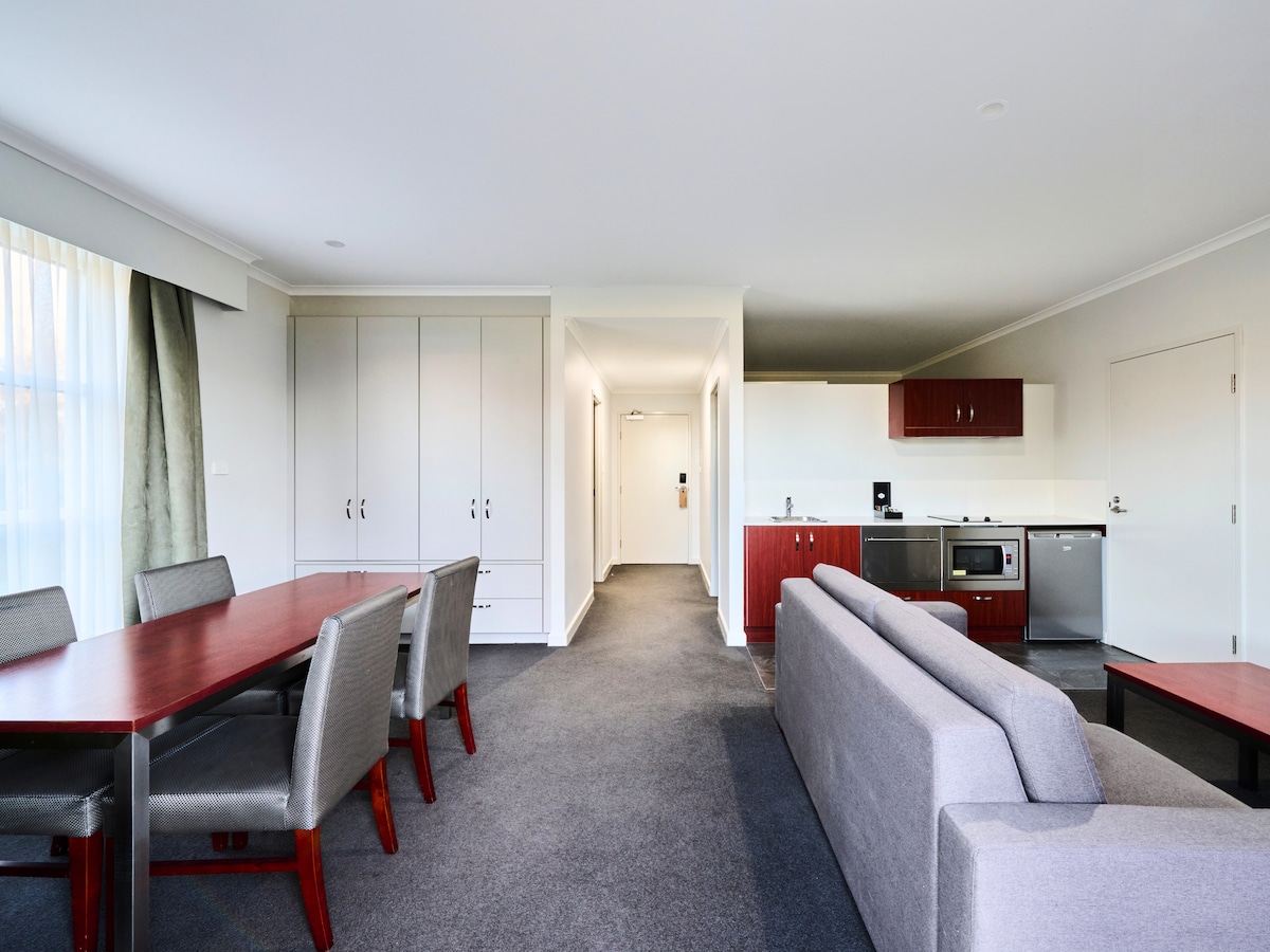 Designed with accessibility in mind, this generously sized Studio Apartment features a queen bed and an ensuite with a walk-in shower and accessible fixtures. You’ll have a fully equipped kitchen with a refrigerator, cooktop, microwave and dishwasher, plus tea and coffee facilities. The apartment also includes a television for in-room entertainment.