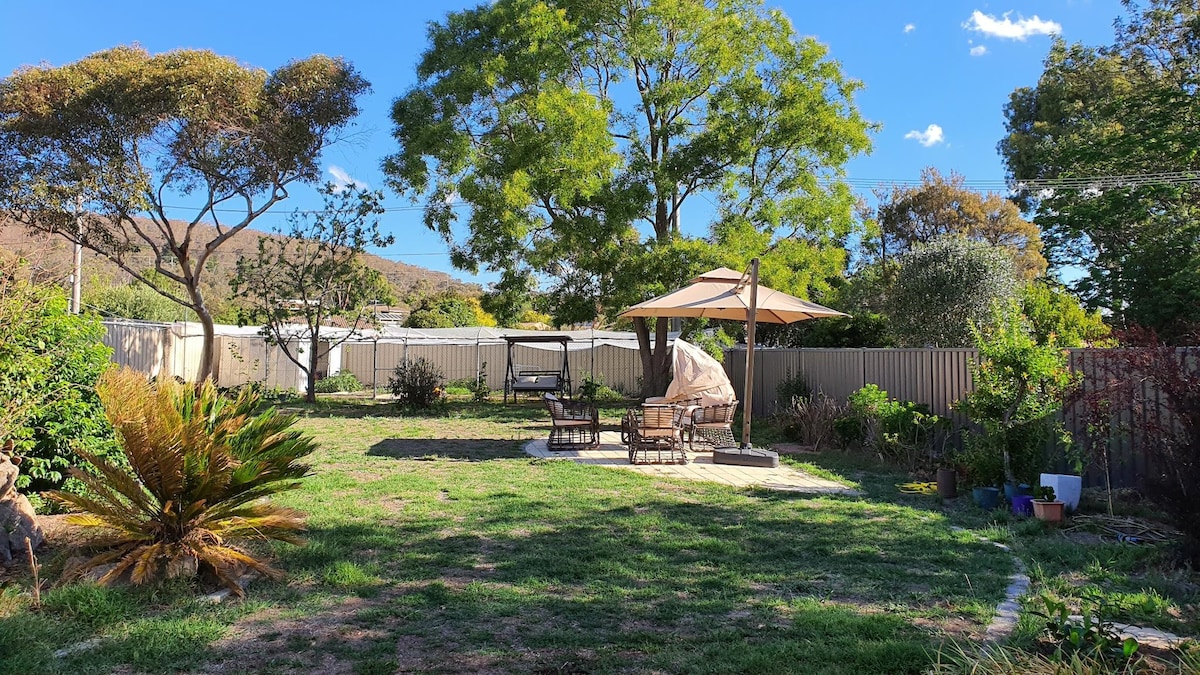* Strictly no animals permitted. * This is a tranquil neighbourhood. We have a strict no-noise policy at all times. Thank you for respecting our neighbors. Bed: queen bed, generous wardrobe. Bath: overhead shower, bath, separate toilet. Living: generous living room. Dining: dining area with 2 seats, kitchenette with generous preparation space. Large garden & deck. Free off-street parking. 300 from Ainslie shops & bus stop, 3 min drive to city centre, 7 min to airport.