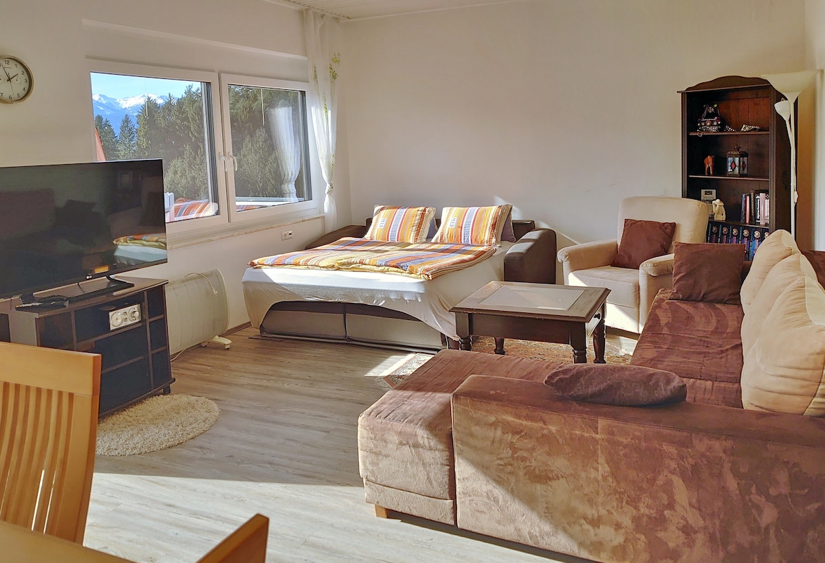 Urlaub in den Alpen Unsere neu renovierte Ferienwohnung in den Bergen (1000 m ü. A.) stellt für jede/n eine warme und mit viel Liebe zum Detail eingerichtete Bleibe zum vernünftigen Preis dar. Im selben Haus gibt es noch eine weitere, komplett getrennte Wohnung, die ebenfalls gemietet werden kann. Die Wohnung selbst ist von außen schlecht einsehbar. Der Ausblick auf die Schweizer Berge ist fantastisch. Abendrot geniessen oder am Beamer einen Film geniessen.