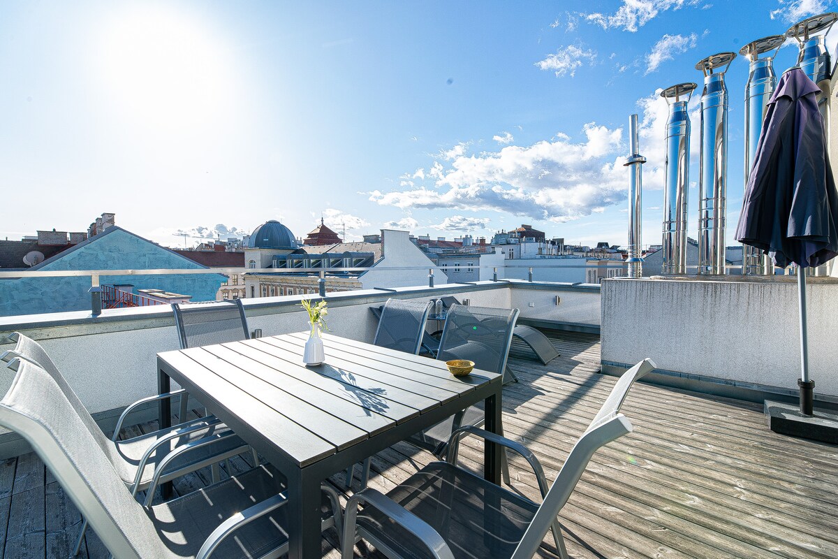 Vienna-Heights is a studio directly under the roof of a 19th century villa in one of the most elegant districts of Vienna. Our house was built in 1897 and therefore there is NO ELEVATOR. It is situated on the 3rd floor. You will be rewarded for the climb with a marvellous view on the city from terrace and room. Big comfortable double-bed, convertible sofa for one or two more guests. Aircondition! Self-check-in Bus station only two minutes walk,, to the center it takes about 15 minutes.