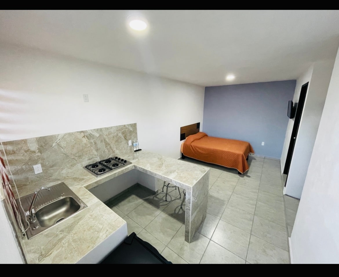 Cómodo departamento para una estadía agradable. Cuenta con buena iluminación y ventilación. Ubicado frente a unidad deportiva. Lugares cercanos; gimnasio, tiendas de abarrotes, centro de salud, farmacia, lavandería, puestos de comida y paraderos de camión. Entradas y salidas rápidas hacia las distintas carreteras. Cuenta con: Habitación con cama kingsize y A/C. Sofacama. Cocina con parrilla y frigobar (con enseres básicos para cocinar). Agua caliente por medio de calentador solar.