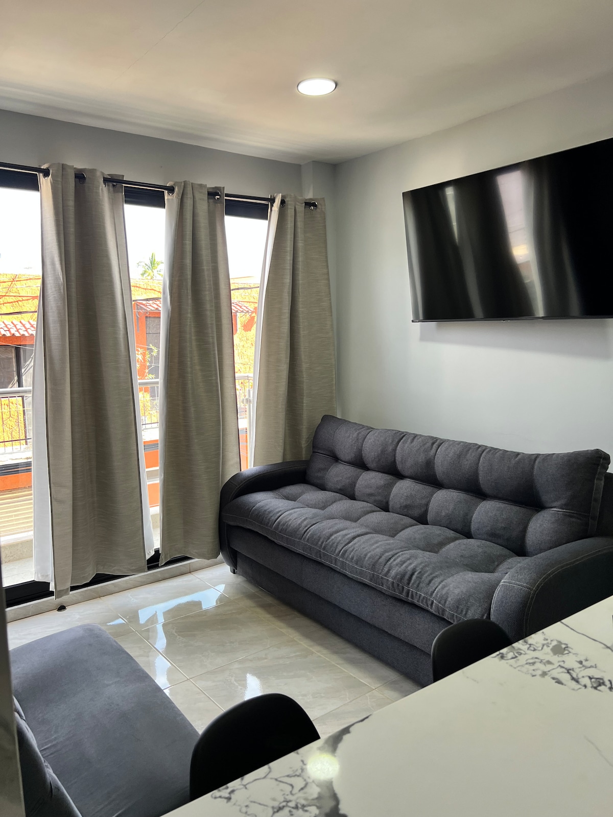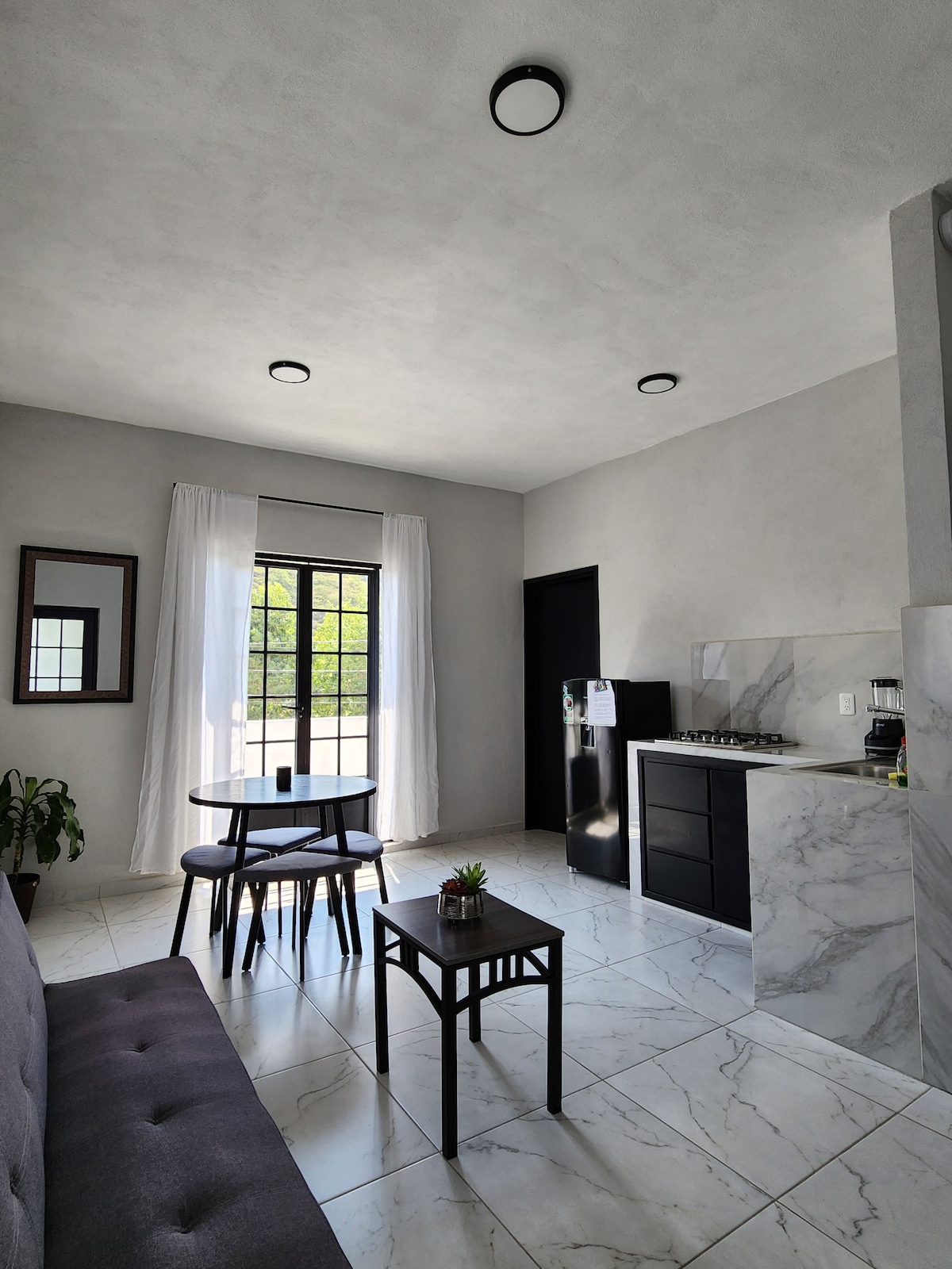 Cómodo departamento para una estadía agradable. Cuenta con buena iluminación y ventilación. Ubicado frente a unidad deportiva. Lugares cercanos; gimnasio, tiendas de abarrotes, centro de salud, farmacia, lavandería, puestos de comida y paraderos de camión. Entradas y salidas rápidas hacia las distintas carreteras. Cuenta con: Habitación con cama kingsize y A/C. Sofacama. Cocina con parrilla y frigobar (con enseres básicos para cocinar). Agua caliente por medio de calentador solar.