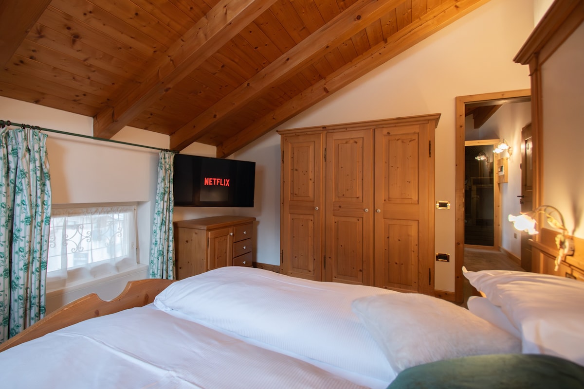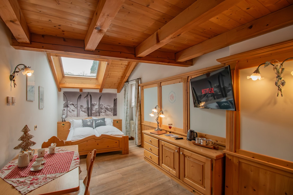 La Suite Stella Alpina è la scelta più romantica del KAISERKRONE Chalet & Spa: una mansarda luminosa con vista sul campanile del borgo alpino e sauna privata, perfetta per momenti di relax e complicità. Dispone di bagno privato, TV con canali stranieri, WiFi gratuito, bollitore con tisane bio wellness, frigobar, cassaforte, asciugacapelli e set cortesia. Protagonista assoluta è la sauna privata in camera: un caldo abbraccio di legno e vapore, dove rilassarsi dopo la neve o una passeggiata, tras.