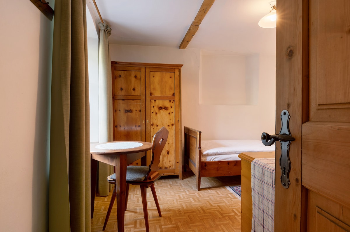 Kleines, einfaches, nostalgisch eingerichtetes Privatzimmer mit Balkon mit grandioser Aussicht im Zentrum von Dorf Tirol. Das Doppelzimmer bietet individuellen und preiswerten Urlaub mit eingebauter privater Dusche und WC. Eine kleine Küche zur gemeinschaftlichen Nutzung im Haus ist vorhanden. Kleiner Balkon, von dem man über den gesamten Meraner Talkessel blickt. Zum Haus gehört ein gemütlicher Biergarten unter Weinreben. Ideal als Ausgangspunkt für Wanderungen oder Radtouren Keine Heizung