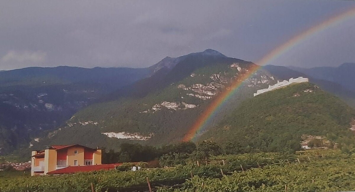 il B&B si trova in un paesino di campagna della Vallagarina a 1 km dalla strada statale 12. La gestione è familiare,posto tranquillo immerso nei vigneti e ulivi .La struttura offre 2 stanze martimoniali con possibile letto aggiuntivo, divano letto (8 ospiti in totale) cucina , soggiorno, amplio bagno , un balcone con vista,un grande terrazza , giardino erboso con sdraio, una piccola piscina jacuzzi riscaldata solo estate, parcheggio auto\moto anche coperto Ottimo per bikers e famiglie.