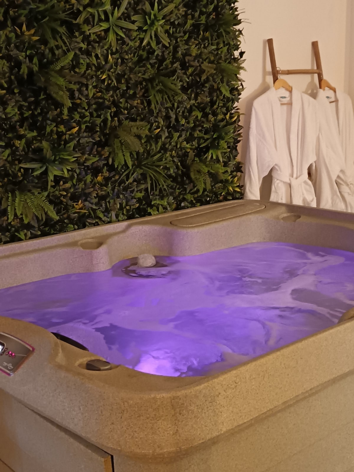 🌿 Un cocon de détente pour tous vos séjours 🌿 ℹ️ L’espace spa 🫧 est entièrement en intérieur, utilisable par tous les temps. La décoration (plafond végétalisé, plantes suspendues, herbe synthétique) recrée une ambiance extérieure tout en restant bien au chaud et à l’abri. 🏠 Logement attenant : chambre, salon, cuisine, salle de bain. Babyphone, linge, peignoirs, chaussons et ménage inclus. Logement non PMR