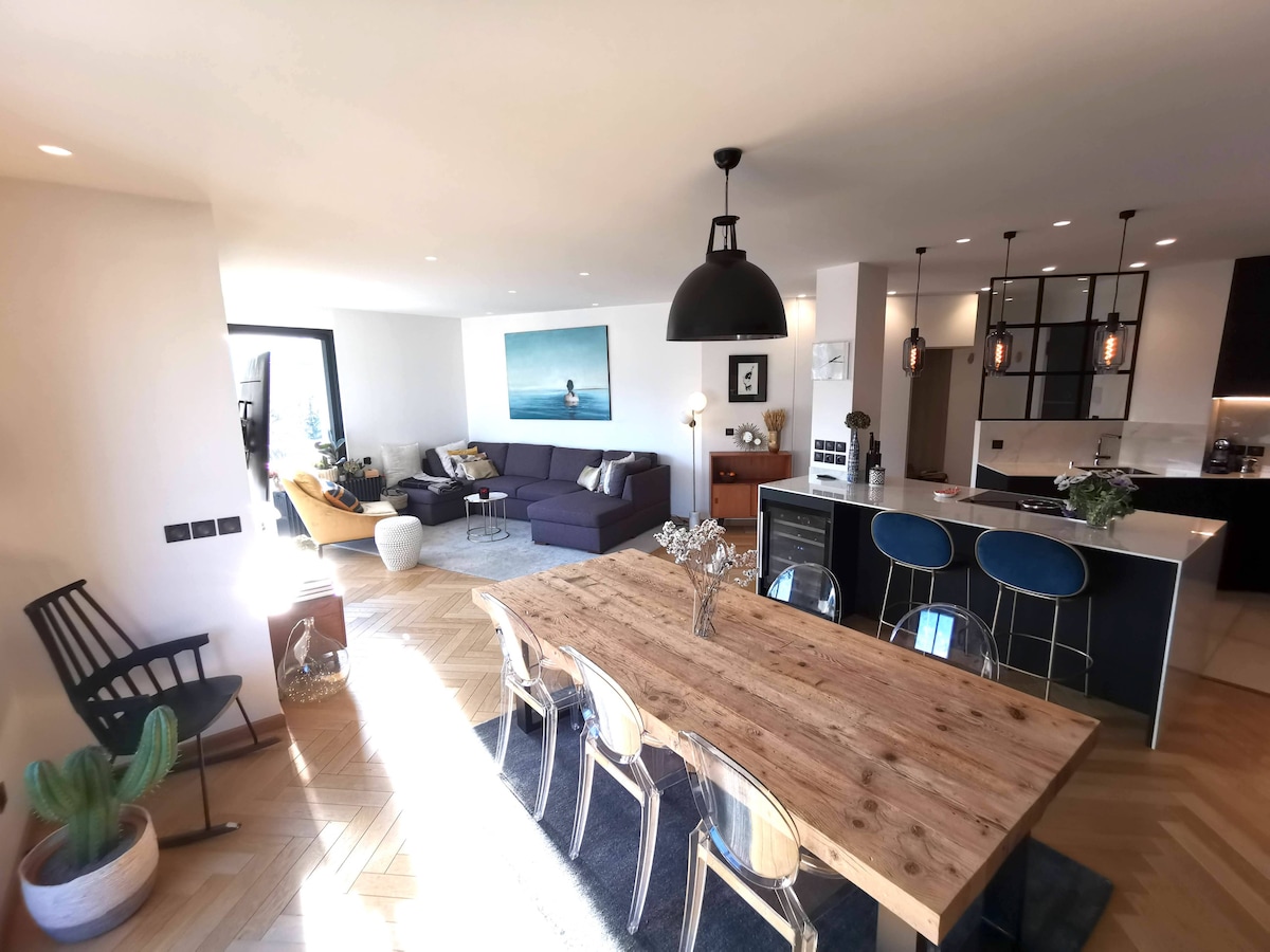 Grand studio de 45m2 avec ascenseur au coeur d'Evian les Bains, proche de tout: à pied le lac, commerces, thermes, palais des congrès, embarcadère pour aller en Suisse. L'espace est organisé avec un coin jour: cuisine /salon où le canapé est convertible pour 2 couchages et un coin nuit avec un lit deux personnes. Connection internet et wifi par fibre. Appartement idéal pour la découverte de la région les curés ou pour le travail! possibilité de parking privé sécurisé payant